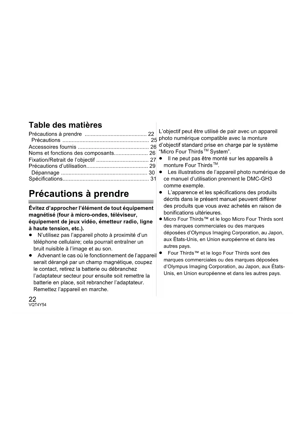 - Spécifications Précautions à prendre Évitez d’approcher l’élément de tout équipement magnétisé (four à micro-ondes, téléviseur, équipement de jeux vidéo, émetteur radio, ligne à haute tension, etc.). ≥ N’utilisez pas l’appareil photo à proximité d’un téléphone cellulaire; cela pourrait entraîner un bruit nuisible à l’image et au son. ≥ Advenant le cas où le fonctionnement de l’appareil serait dérangé par un champ magnétique, coupez le contact, retirez la batterie ou débranchez l’adaptateur secteur pour ensuite soit remettre la batterie en place, soit rebrancher l’adaptateur. Remettez l’appareil en marche. L’objectif peut être utilisé de pair avec un appareil photo numérique compatible avec la monture d’objectif standard prise en charge par le système “Micro Four Thirds p. 31