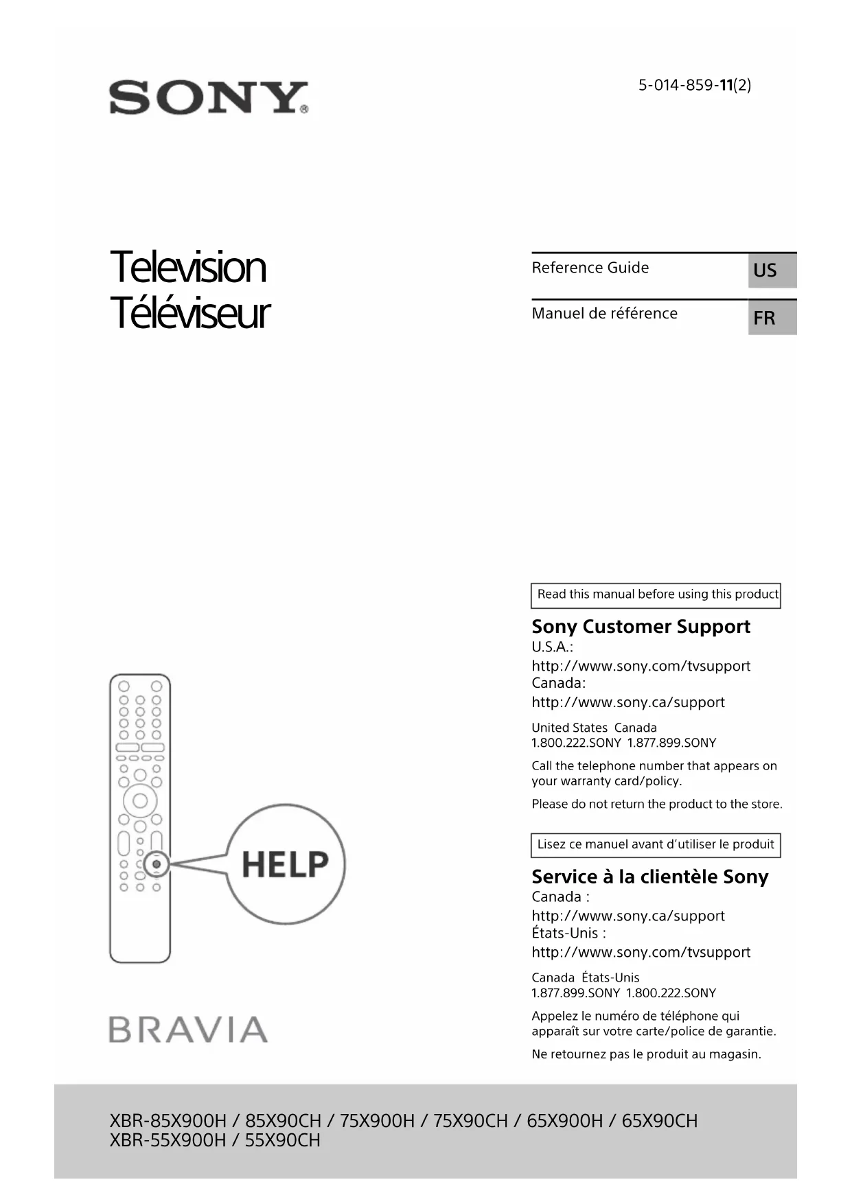 US• .C:\Users\User\Desktop\NX.NXB\SY20_NX_UC2_RG_111\ML\CF\FY20\Map\NX\50148 59112_FR.fm master page: Left XBR-85X900H / 85X90CH / 75X900H / 75X90CH / 65X900H / 65X90CH / 55X900H / 55X90CH 5-014-859-11(2) À propos des manuels Ce téléviseur est fourni avec les manuels suivants. Veuillez conserver ces manuels à titre de référence. Manuel de configuration