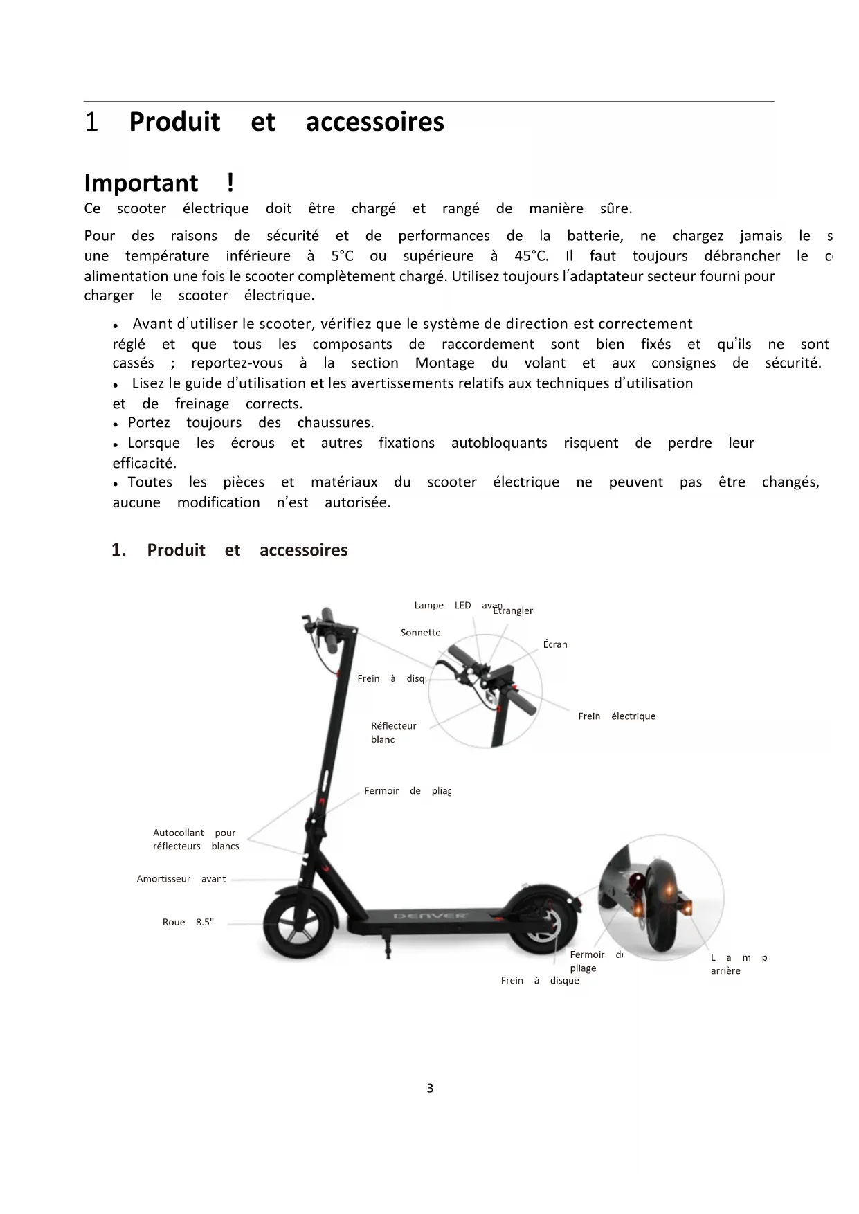 - Guide d’utilisation SEL-85350 facebook.com/denverelectronics Avant d'utiliser ce produit, lisez toutes les instructions pour un assemblage et des opérations sans risque. Le guide d’ utilisation comprend des informations sur les fonctions et l’utilisation du scooter électrique. Avant d’utiliser ce scooter électrique, vous devez vous familiariser avec son utilisation afin de le garder dans le meilleur état possible. Cet appareil peut être utilisé par des enfants de 14 ans et plus et des personnes ayant des capacités physiques, sensorielles ou mentales réduites, ou ne disposant pas de l’expérience et de connaissances si elles sont supervisées ou ont été formées sur son utilisation d'une manière sure, et sont conscientes des risques encourus.Les enfants en bas âge ne doivent pas jouer avec l’appareil. Le nettoyage et la maintenance de l’utilisateur ne doivent pas être effectués par les enfants sans supervision. Version 1.02 Table des matières 1 Produit et accessoires p. 3