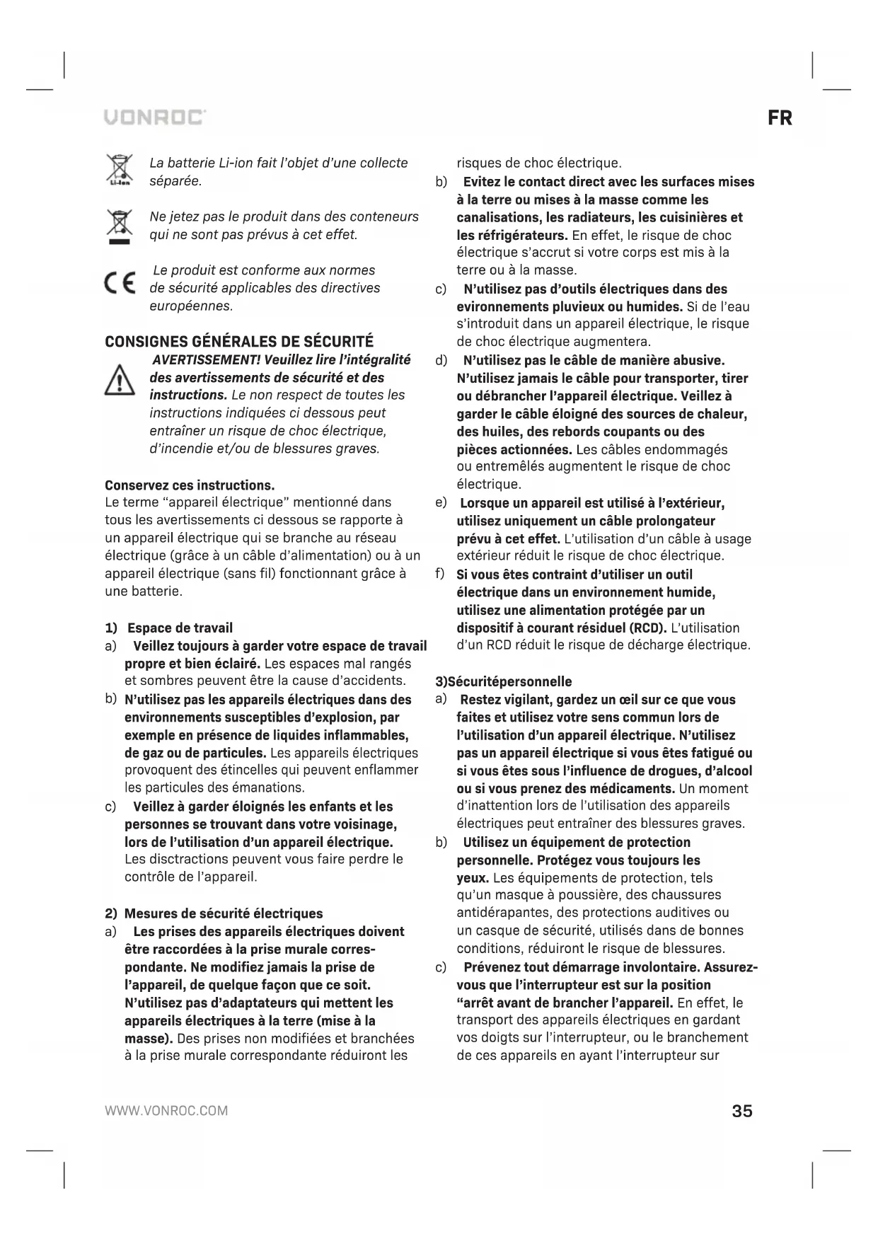 Avant le nettoyage et l’entretien, mettez toujours la machine hors tension et retirez la batterie de la machine. Nettoyez le corps de la machine régulièrement au moyen d’un chiffon doux, de préférence après cha- que utilisation. Vérifiez que les ouvertures d’aérati- on ne sont pas obstruées ni sales. Utilisez un chif- fon doux légèrement humidifié avec de la mousse de savon pour nettoyer les taches persistantes. N’utilisez pas de produits de nettoyage tels que l’essence, l’alcool, l’ammoniac, etc.; ces produits peuvent endommager les parties synthétiques. ENVIRONNEMENT Les équipements électroniques ou électriques défectueux ou destinés à être mis au rebut doivent être déposés aux points de recyclage appropriés. Uniquement pour les pays de l’UE Ne jetez pas les outils électriques avec les déchets domestiques. Selon la Directive européenne 2012/19/CE relative aux déchets d’équipements électriques et électroniques et sa mise en œuvre dans le droit national, les outils électriques hors d’usage doivent être collectés séparément et mis au rebut de manière écologique. GARANTIE Les produits VONROC sont développés aux plus hau- ts standards de qualité et ils sont garantis contre les défauts de pièces et de main d’oeuvre pendant la durée légale stipulée à partir de la date d’achat d’o- rigine du produit. En cas d’une quelconque panne du produit pendant cette durée qui serait due à un défaut matériel et/ou de main d’oeuvre, contactez directement VONROC. Les circonstances suivantes ne sont pas prises en charge par la garantie: