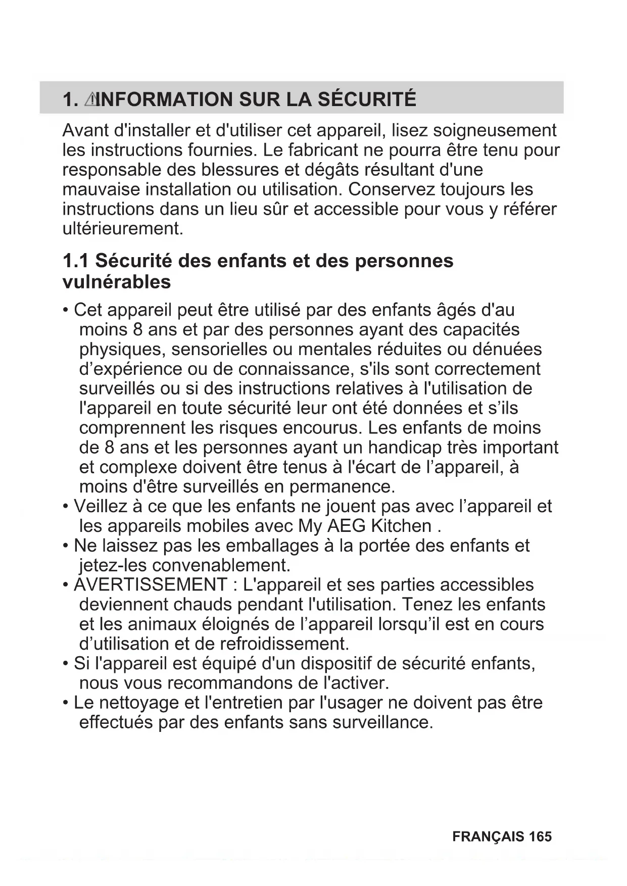 FRANÇAIS 163My AEG Kitchen app 164 FRANÇAIS1. INFORMATION SUR LA SÉCURITÉ Avant d'installer et d'utiliser cet appareil, lisez soigneusement les instructions fournies. Le fabricant ne pourra être tenu pour responsable des blessures et dégâts résultant d'une mauvaise installation ou utilisation. Conservez toujours les instructions dans un lieu sûr et accessible pour vous y référer ultérieurement.