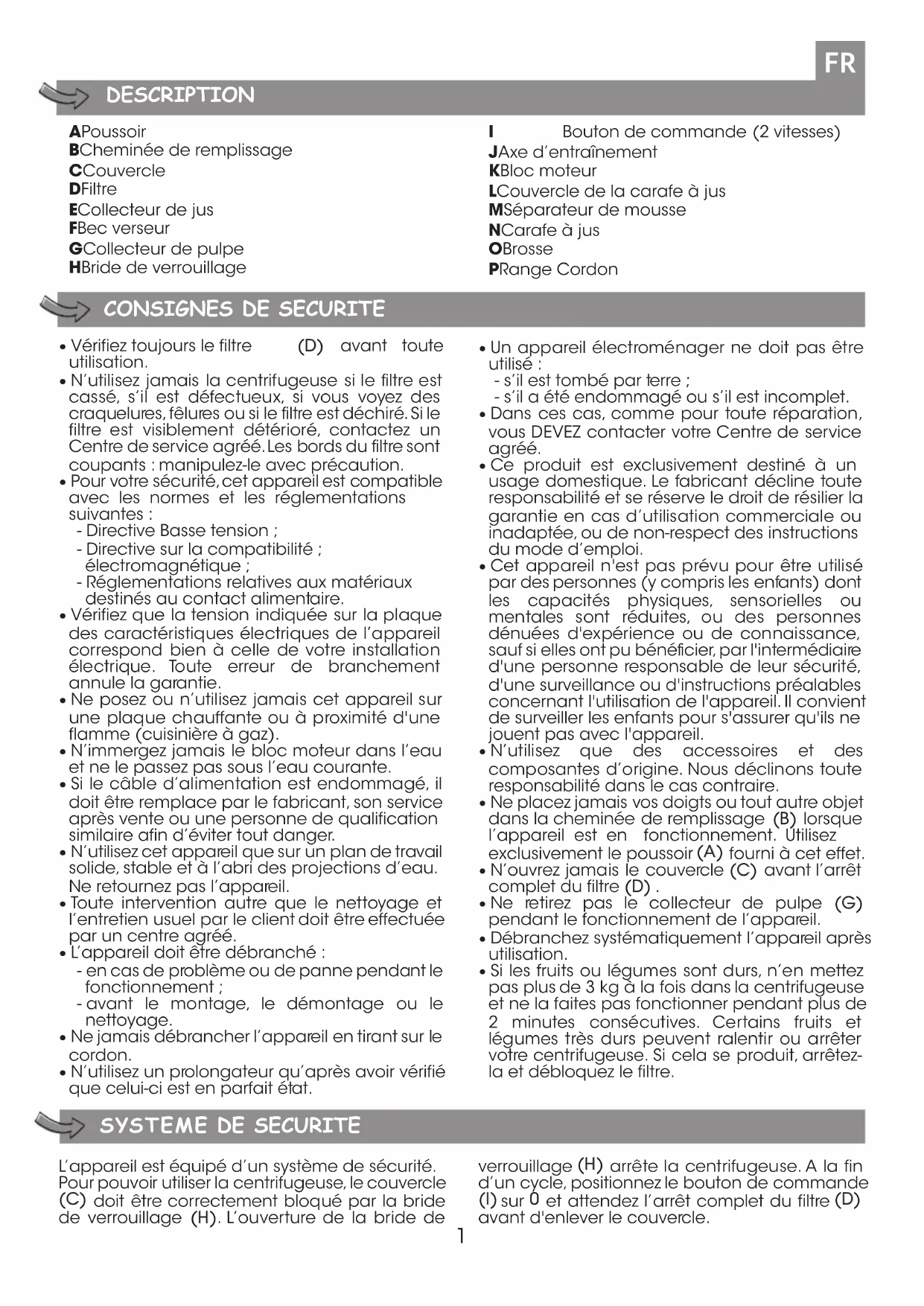 - Important : Les jus extraits doivent être consommés immédiatement. Au contact de l’air, l’oxydation du jus s’effectue rapidement et peut modifier son goût, sa couleur et ses qualités nutritionnelles. Les jus de pommes et de poires brunissent très vite. Ajoutez quelques gouttes de jus de citron pour ralentir la coloration.4 RECYCLAGE La protection de l’environnement est une priorité ! Votre appareil contient des éléments précieux qui peuvent être récupérés ou recyclés. Lorsqu’il est en fin de vie, déposez-le dans une déchetterie pour qu’il soit recyclé.5 DESCRIPTION A Pusher B Feed tube C Cover D Sieve E Juice collector F Pouring spout G Pulp collector H Safety clamp I Control switch (2 speeds) J Drive shaft K Motor unit L Juice jug cover M Foam separator N Juice jug O Brush P Cord storage SAFETY INSTRUCTIONS