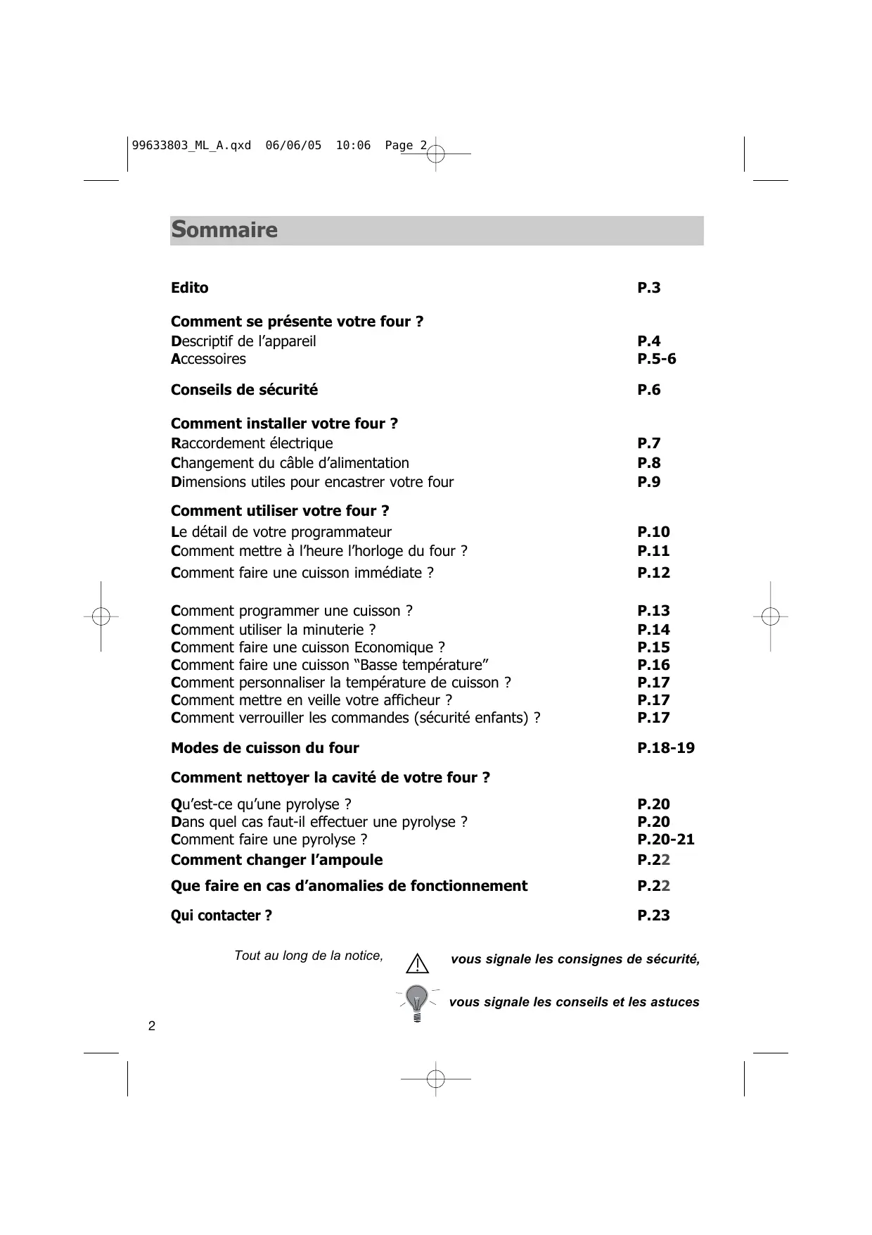 Comment se présente votre four ? Descriptif de l’appareil Accessoires P.4 P.5-6 Conseils de sécurité P.6 Comment installer votre four ? Raccordement électrique Changement du câble d’alimentation Dimensions utiles pour encastrer votre four P.7 P.8 P.9 Comment utiliser votre four ? Le détail de votre programmateur Comment mettre à l’heure l’horloge du four ? P.10 P.11 Comment faire une cuisson immédiate ? P.12 Comment Comment Comment Comment Comment Comment Comment programmer une cuisson ? utiliser la minuterie ? faire une cuisson Economique ? faire une cuisson “Basse température” personnaliser la température de cuisson ? mettre en veille votre afficheur ? verrouiller les commandes (sécurité enfants) ? Modes de cuisson du four P.18-19 Comment nettoyer la cavité de votre four ? Qu’est-ce qu’une pyrolyse ? Dans quel cas faut-il effectuer une pyrolyse ? Comment faire une pyrolyse ? Comment changer l’ampoule P.20 P.20 P.20-21 P.22 Que faire en cas d’anomalies de fonctionnement P.22 Qui contacter ? P.23 Tout au long de la notice, vous signale les consignes de sécurité, vous signale les conseils et les astuces
