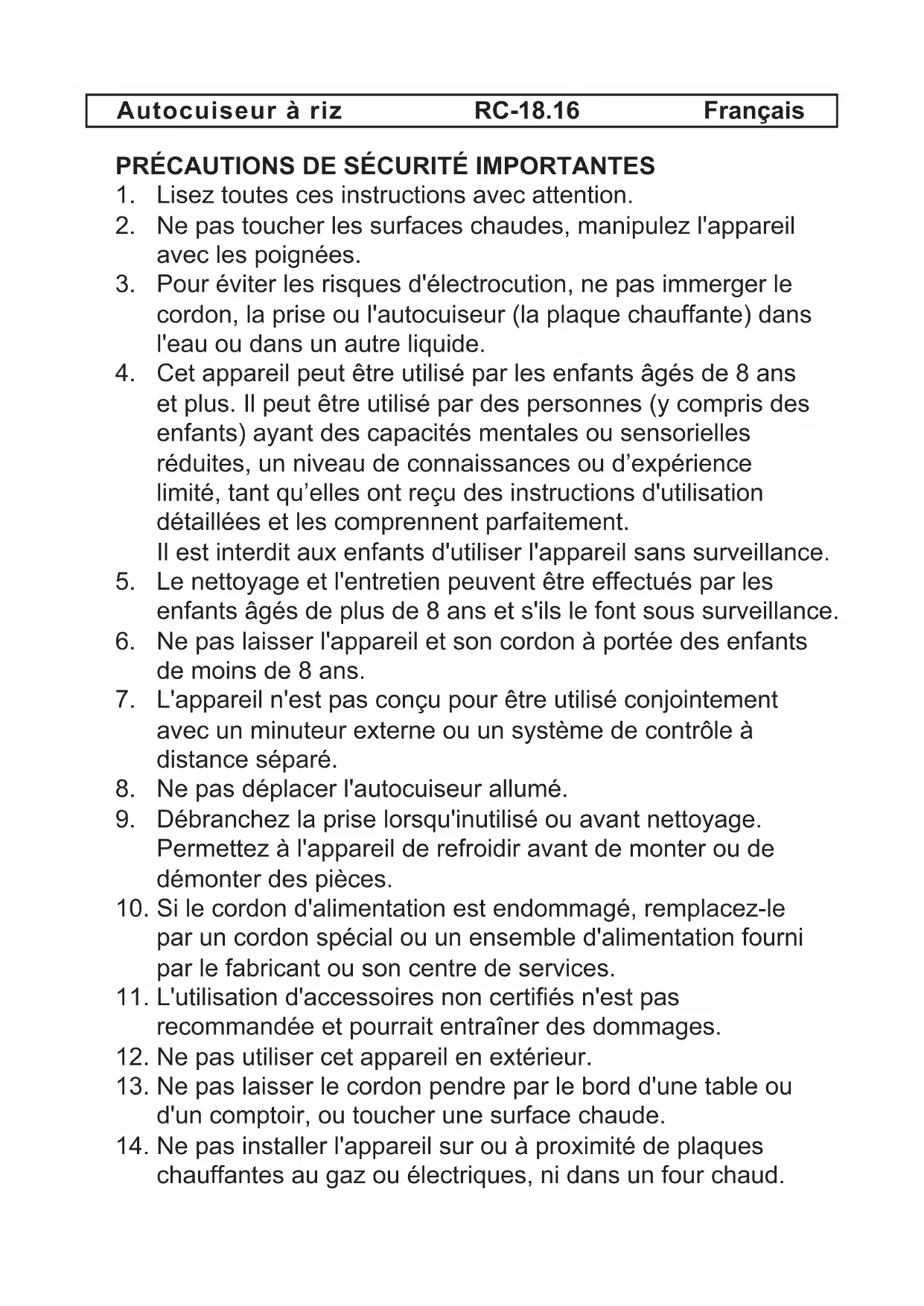 Alimentation : 220-240V- 50Hz Alimentation : 700W QQJQ[J\] Le symbole ci-dessus et apposé sur le produit indique que ce dernier appartient à la catégorie des équipements électriques et électroniques et ne doit donc pas être mis au rebut avec les autres déchets domestiques ou commerciaux en fin de vie utile. La directive Waste of Electrical and Electronic Equipment (WEEE) Directive (2002/96/EC) a été mise en place pour encourager la mise en place des meilleures techniques disponibles pour la récupération et le recyclage, minimisant ainsi l'impact négatif des substances nocives et dangereuses sur l'environnement et éviter la prolifération des décharges. Prenez contact avec les autorités locales compétentes pour en savoir plus sur la manière correcte de disposer des équipements électriques et électroniques. RC-18.16 Español