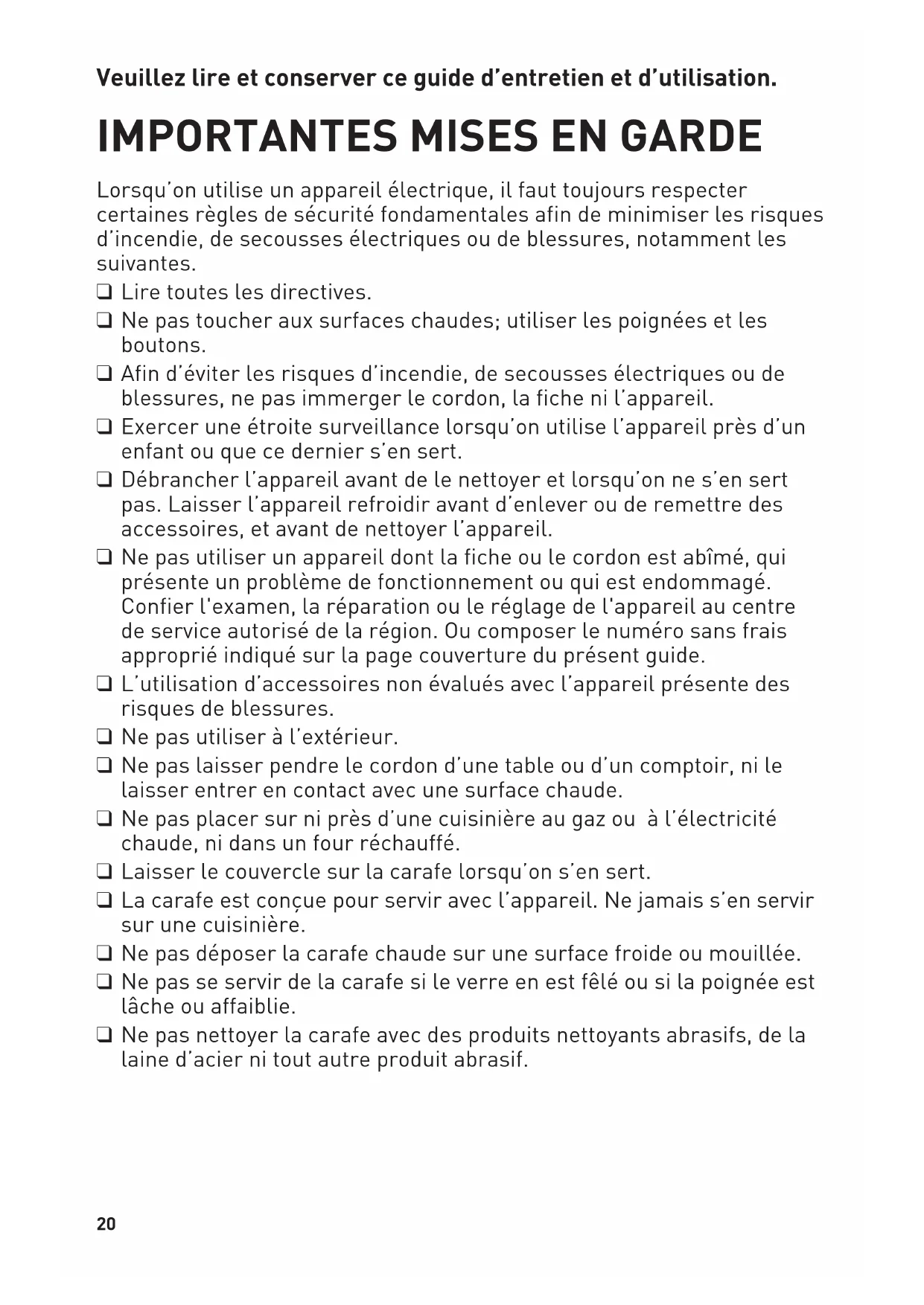 La carafe est conçue pour servir avec l’appareil. Ne jamais s’en servir sur une cuisinière.