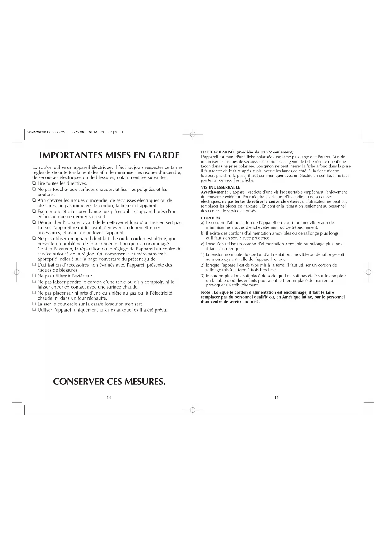 du couvercle extérieur. Pour réduire les risques d’incendie ou de secousses électriques, ne pas tenter de retirer le couvercle extérieur. L’utilisateur ne peut pas remplacer les pièces de l’appareil. En confier la réparation seulement au personnel des centres de service autorisés. CORDON a) Le cordon d’alimentation de l’appareil est court (ou amovible) afin de minimiser les risques d’enchevêtrement ou de trébuchement. b) Il existe des cordons d’alimentation amovibles ou de rallonge plus longs et il faut s’en servir avec prudence. c) Lorsqu’on utilise un cordon d’alimentation amovible ou rallonge plus long, il faut s’assurer que :