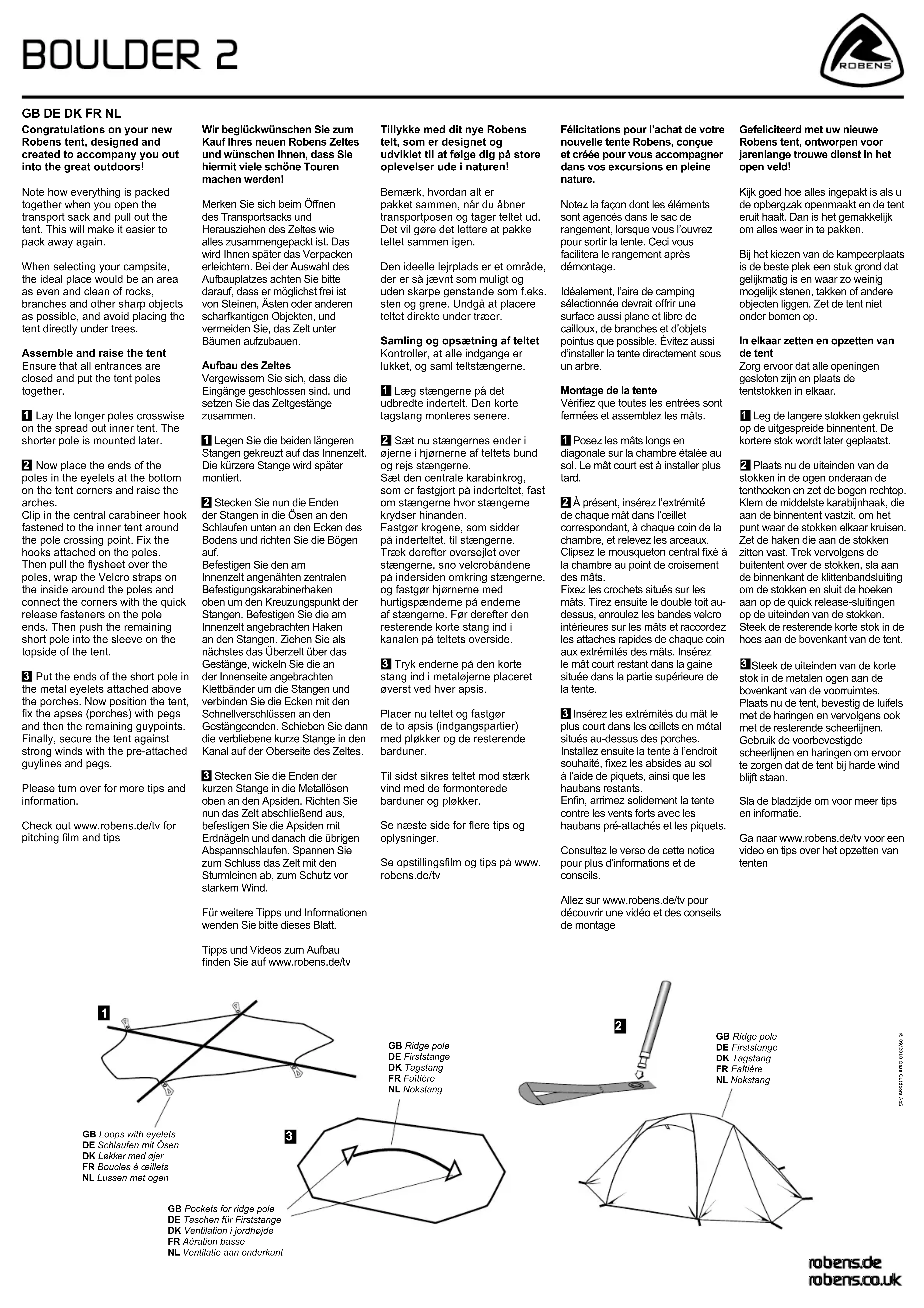 Tryk enderne på den korte stang ind i metaløjerne placeret øverst ved hver apsis. Placer nu teltet og fastgør de to apsis (indgangspartier) med pløkker og de resterende barduner. Til sidst sikres teltet mod stærk vind med de formonterede barduner og pløkker. Se næste side for ere tips og oplysninger. Se opstillingslm og tips på www. robens.de/tv Félicitations pour l’achat de votre nouvelle tente Robens, conçue et créée pour vous accompagner dans vos excursions en pleine nature. Notez la façon dont les éléments sont agencés dans le sac de rangement, lorsque vous l’ouvrez pour sortir la tente. Ceci vous facilitera le rangement après démontage. Idéalement, l’aire de camping sélectionnée devrait orir une surface aussi plane et libre de cailloux, de branches et d’objets pointus que possible. Évitez aussi d’installer la tente directement sous un arbre. Montage de la tente Vériez que toutes les entrées sont fermées et assemblez les mâts.