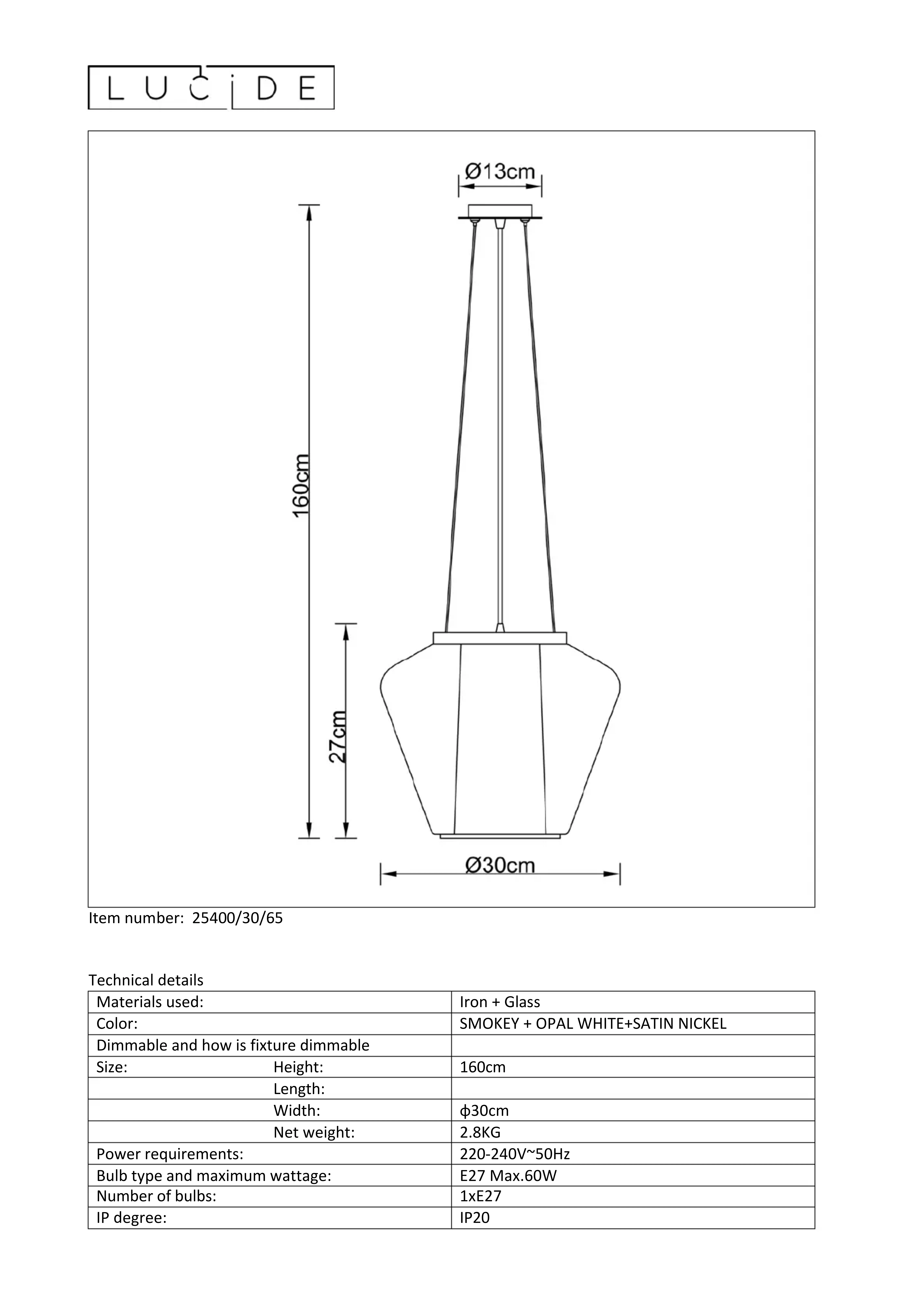 Le Lucide Stian 254003065 n'est pas dimmable. Assurez-vous de l'utiliser avec une ampoule non dimmable.