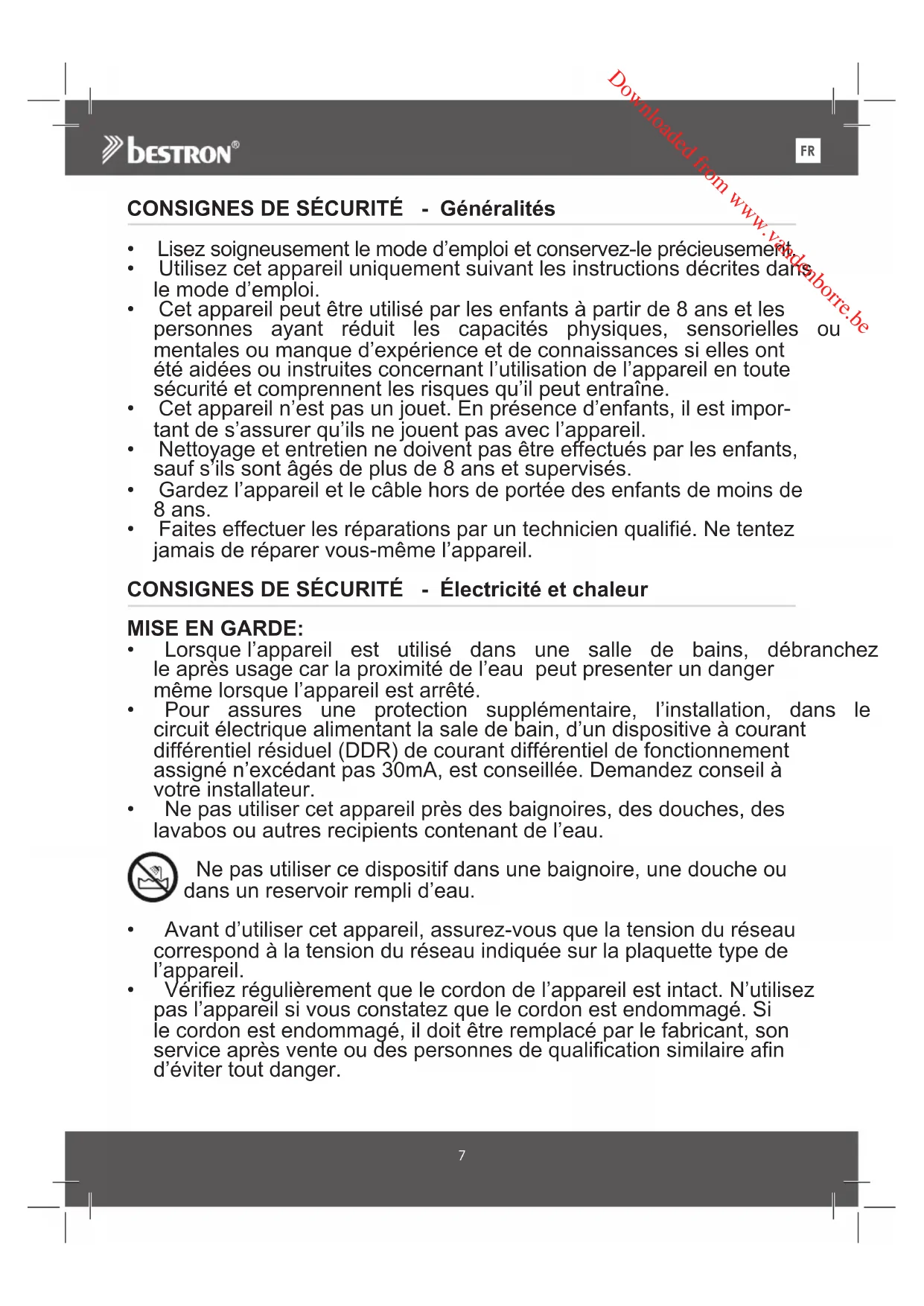 cementoularéparationdepiècesdéfectueuses.L’importateurnepeutêtretenuresponsabled’aucun dommageindirect,nid’aucuneconséquencequellequ’ellesoit,causéparouayantunquelconque rapportavecl’appareilqu’ilafourni. 10.Pourpouvoirfaireappelàlagarantie,vouspouvezvousadresseràvotrerevendeur.Bestronoffreaussi lapossibilitédefaireréparerl’appareildirectementparleserviceaprès-ventedeBestron.Toutefois, n’envoyezjamaisriensansavoirreçud’instructionsaupréalable.Lecolispourraiteneffetêtrerefusé etlesfraiséventuelsseraientàvotrecharge.Prenezcontactavecleserviceaprès-ventequivousex- pliqueracommentvousdevezemballeretexpédierl’appareil. 11.L’appareiln’estpasdestinéàl’usageprofessionnel. MAINTENANCE Si,parmalheur,unepanneseproduisait,veuillezcontacterleservicedemaintenancedeBESTRON: www.bestron.com/service