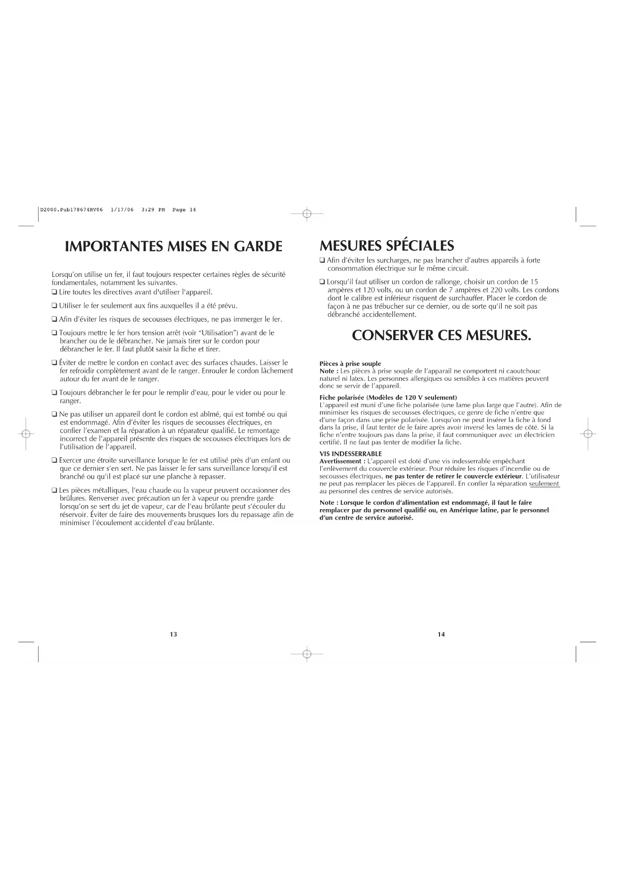 Lorsqu’on utilise un fer, il faut toujours respecter certaines règles de sécurité fondamentales, notamment les suivantes. ❑ Lire toutes les directives avant d'utiliser l'appareil. ❑ Utiliser le fer seulement aux fins auxquelles il a été prévu. ❑ Afin d’éviter les risques de secousses électriques, ne pas immerger le fer. ❑ Toujours mettre le fer hors tension arrêt (voir “Utilisation”) avant de le brancher ou de le débrancher. Ne jamais tirer sur le cordon pour débrancher le fer. Il faut plutôt saisir la fiche et tirer. ❑ Éviter de mettre le cordon en contact avec des surfaces chaudes. Laisser le fer refroidir complètement avant de le ranger. Enrouler le cordon lâchement autour du fer avant de le ranger. ❑ Toujours débrancher le fer pour le remplir d’eau, pour le vider ou pour le ranger. ❑ Ne pas utiliser un appareil dont le cordon est abîmé, qui est tombé ou qui est endommagé. Afin d’éviter les risques de secousses électriques, en confier l’examen et la réparation à un réparateur qualifié. Le remontage incorrect de l’appareil présente des risques de secousses électriques lors de l’utilisation de l’appareil. ❑ Exercer une étroite surveillance lorsque le fer est utilisé près d’un enfant ou que ce dernier s’en sert. Ne pas laisser le fer sans surveillance lorsqu’il est branché ou qu’il est placé sur une planche à repasser. ❑ Les pièces métalliques, l’eau chaude ou la vapeur peuvent occasionner des brûlures. Renverser avec précaution un fer à vapeur ou prendre garde lorsqu’on se sert du jet de vapeur, car de l’eau brûlante peut s’écouler du réservoir. Éviter de faire des mouvements brusques lors du repassage afin de minimiser l’écoulement accidentel d’eau brûlante.