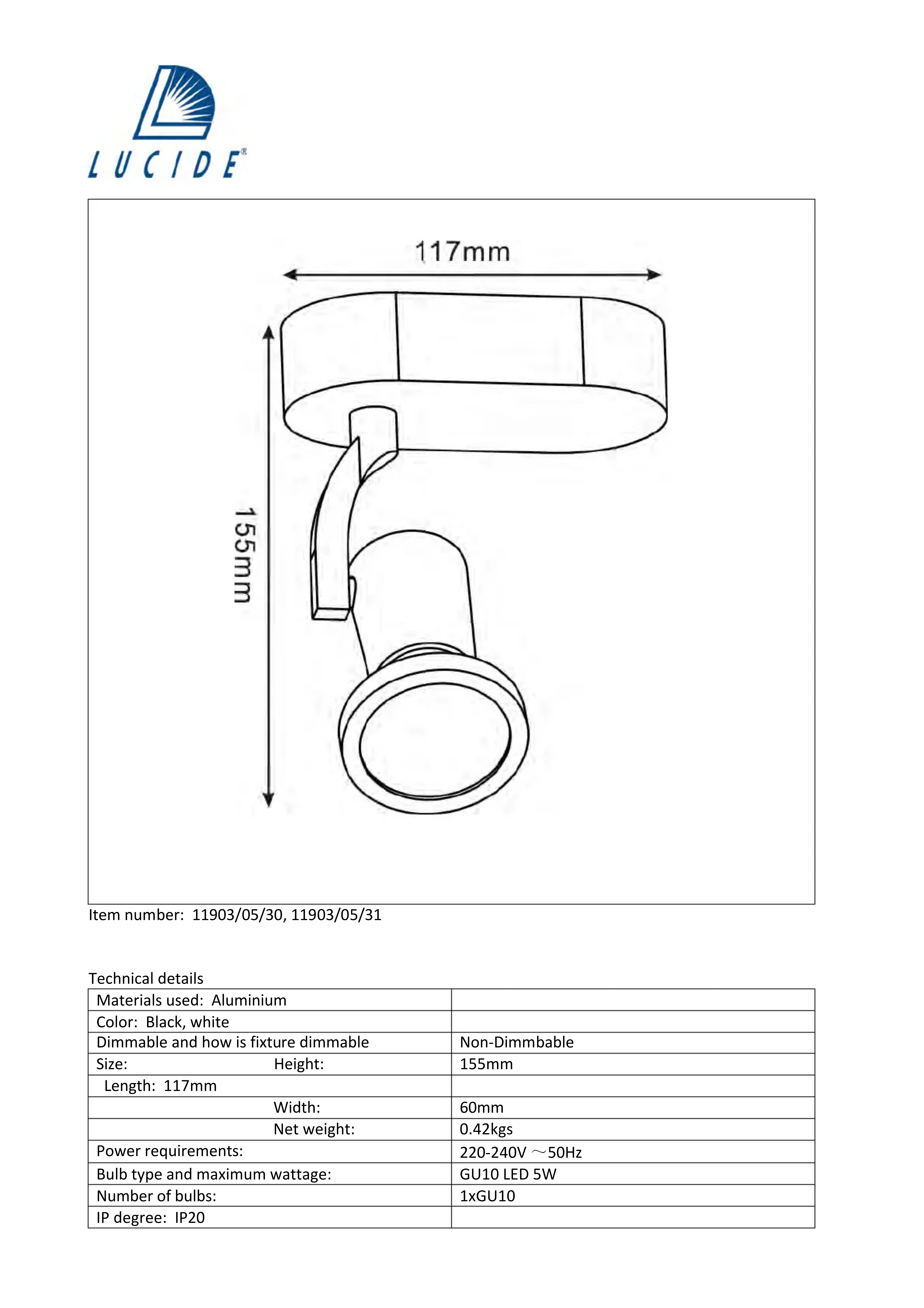 | Sécurité | Respecter la puissance maximale de l'ampoule, ne pas exposer à l'humidité |