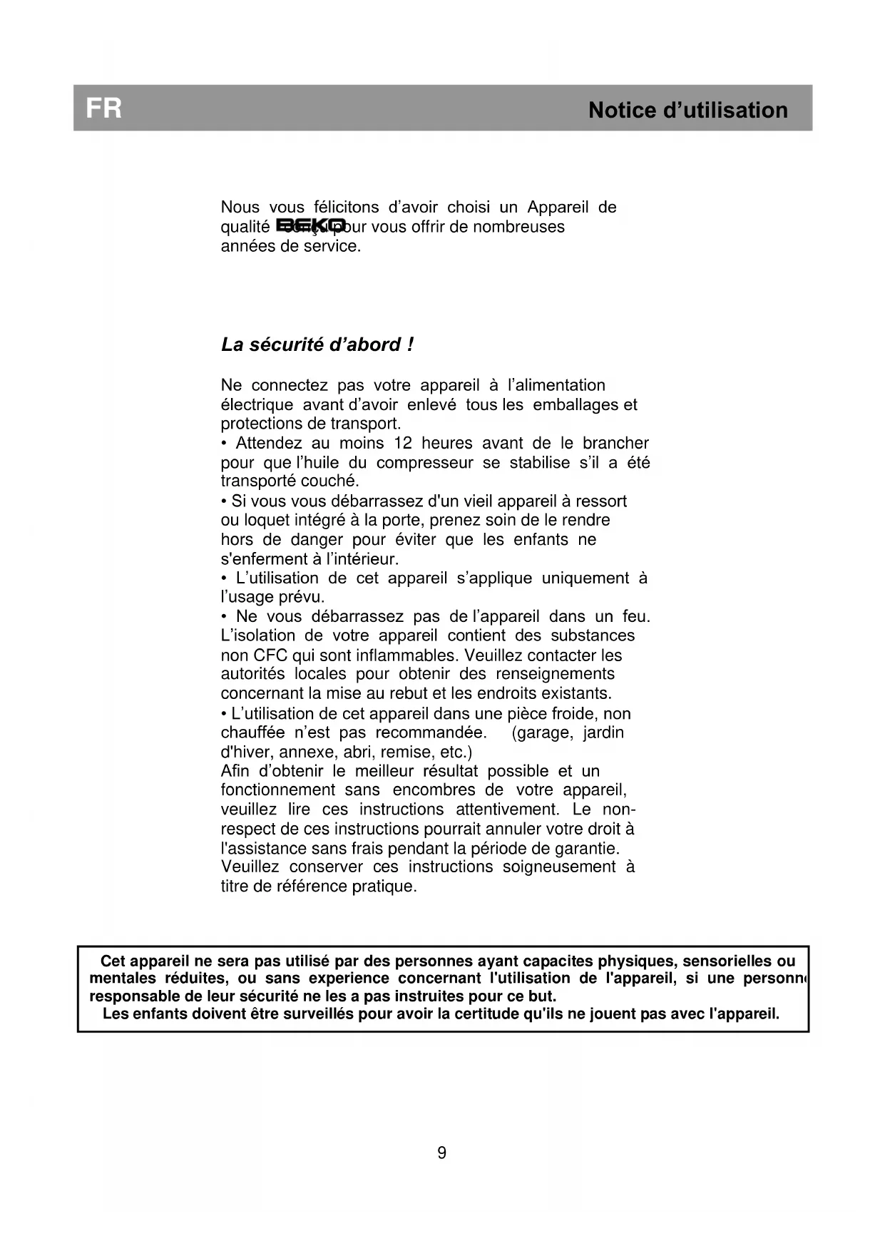 Cet appareil ne sera pas utilisé par des personnes ayant capacites physiques, sensorielles ou mentales réduites, ou sans experience concernant l'utilisation de l'appareil, si une personne responsable de leur sécurité ne les a pas instruites pour ce but. Les enfants doivent être surveillés pour avoir la certitude qu'ils ne jouent pas avec l'appareil.FR Notice d’utilisation Conditions électriques Avant de brancher l'appareil à la prise murale, vérifiez que la tension et la fréquence indiquées sur la plaque signalétique à l'intérieur de l'appareil correspondent à votre alimentation électrique. Nous recommandons de connecter cet appareil au réseau électrique par le biais d’une prise dotée d’un commutateur et d'un fusible et placée de façon à être facile d’accès. La prise doit être accessible après l'installation afin de permettre le débranchement de l'appareil du secteur. Avertissement ! Cet appareil doit être branché à une borne de mise à la terre. Les réparations de l'appareillage électrique doivent être réalisées par des techniciens qualifiés. Si le câble d’alimentation est endommagé, il doit être remplacé par le constructeur ou le service clientèle afin d’écarter tout danger. ATTENTION ! Cet appareil fonctionne avec du R600a, un gaz qui contribue à la protection de l’environnement mais qui est inflammable. Pendant le transport et l’installation du produit, veillez à ne pas endommager le système réfrigérant. Si le système réfrigérant est abîmé et qu’une fuite de gaz se produit, tenez l’appareil à l’écart des sources de flammes vives et aérer bien la pièce. AVERTISSEMENT - N’utilisez pas d'outils mécaniques ou autres moyens pour accélérer le processus de décongélation autres que ceux qui sont recommandés par le fabricant. AVERTISSEMENT- N’abîmez pas le circuit réfrigérant. AVERTISSEMENT- Ne faites pas fonctionner d'appareils électriques à l'intérieur des compartiments de conservation de denrées, à moins qu’ils soient conformes au type d'appareils recommandés par le fabricant. AVERTISSEMENT- Si le cordon d’alimentation est endommagé, celui-ci doit être remplacé par le fabricant, ses agents agréés ou tout autre agent qualifié afin d'être à l'abri de tout danger. Instructions de transport