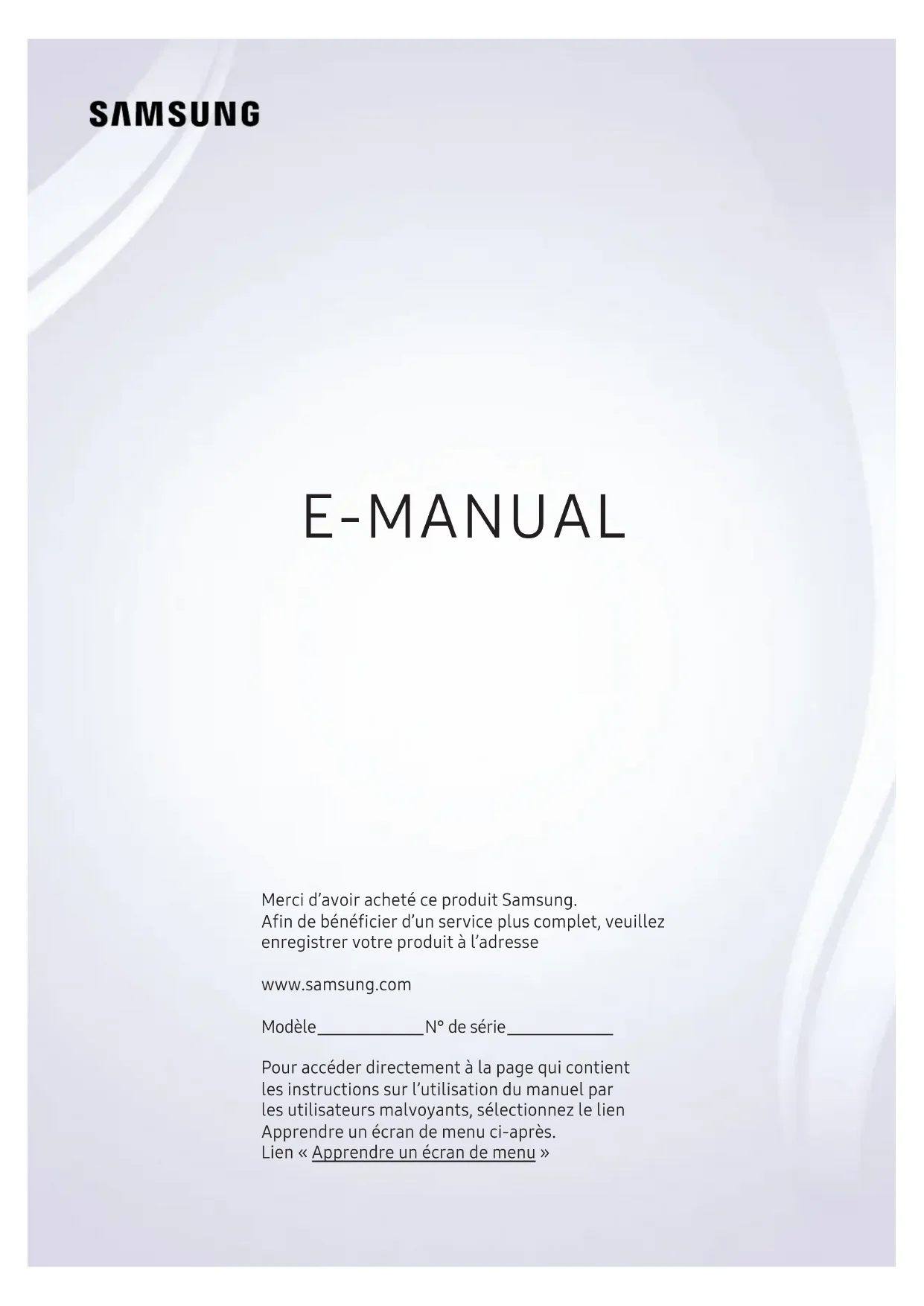 E-MANUAL Merci d’avoir acheté ce produit Samsung. Afin de bénéficier d’un service plus complet, veuillez enregistrer votre produit à l’adresse www.samsung.com M o d è l e __________________ N ° d e s é r i e __________________ Pour accéder directement à la page qui contient les instructions sur l’utilisation du manuel par les utilisateurs malvoyants, sélectionnez le lien Apprendre un écran de menu ci-après. Lien «Apprendre un écran de menu» FrançaisRésolution des problèmes de connectivité Internet 26 Résolution des problèmes de connectivité Internet Connexion de périphériques vidéo 28 Connexion à l'aide d'un câble HDMI 29 Connexion avec un câble composant (modèles dotés d'un connecteur COMPONENT IN / AV IN uniquement) 30 Connexion avec un câble composite (modèles dotés d'un connecteur COMPONENT IN / AV IN uniquement) Connexions d'entrée et de sortie audio 31 Connexion à l'aide d'un câble HDMI (ARC) 31 Connexion à l'aide d'un câble audio numérique (optique) 31 Connexion au moyen d'un réseau sans fil 32 Connexion des périphériques Bluetooth Connexion à un ordinateur 32 Connexion via le port HDMI ― Partage d'écran (HDMI) Connexion de votre Périphérique mobile 33 Connexion du téléviseur via l’application SmartThings 34 Mise en miroir bidirectionnelle de votre téléviseur et de votre périphérique mobile à l’aide de l’application SmartThings 34 Gestion d'un périphérique mobile Basculement entre les différents périphériques externes connectés au téléviseur 35 Changement de signal d'entrée 36 Modification du nom et de l’icône d’un périphérique externe 37 Utilisation des autres fonctions Remarques sur la connexion 37 Remarque sur la connexion HDMI 38 Remarque sur la connexion des périphériques audio 39 Remarque sur la connexion des ordinateurs 39 Remarque sur la connexion des périphériques mobiles Guides de démarrage Connectez le Samsung Smart Remote au téléviseur. L'utilisation du Smart Hub Utilisation de Ambient mode 10 États de l'écran relatifs au Ambient mode 11 Changement de contenu et paramètres du Ambient mode L'utilisation du Interaction vocale 13 Exécution de l’Interaction vocale 14 Découverte de Guide des commandes vocales 15 À lire avant d’utiliser les Interaction vocale Mise à jour du logiciel du téléviseur 16 Mise à niveau du logiciel du téléviseur vers la dernière version 16 Mise à jour automatique du téléviseur Obtention d’aide 17 Assistance via la fonction Gestion à distance 18 Recherche des coordonnées du service 18 Demande de service Connexions Guide de connexion Raccordement d'une antenne (Antenne) Connexion à Internet 21 Connexion à votre réseau Internet 23 Vérification de l’état de la connexion Internet 23 Redémarrage de votre réseau 23 Mise sous tension du téléviseur à l’aide d’un Périphérique mobile 23 Connexion d'un dispositif de contrôle IP au téléviseur. 24 Configuration d’une connexion Internet via IPv6 24 Modification du nom du téléviseur sur un réseau Connexion à un réseau au moyen d'un dongle mobile (Pour l'Inde uniquement) Sommaire 2Utilisation de Remote Access Utilisation du service Mes Applications 72 Installation et exécution d'une application 73 Gestion des applications achetées ou installées 74 Evaluation d'applications Utilisation de l’application Galerie Utilisation de l’application Guide universel Utilisation de l’application SmartThings Utilisation de e-Manual 78 Lancement du e-Manual 79 Utilisation des boutons dans le e-Manual Utilisation de Internet Lecture des images/vidéos/fichiers musicaux 81 Lecture de contenu multimédia Utilisation de la fonction Interaction vocale 82 Exécution de l’Interaction vocale 83 Présentation du Guide des commandes vocales 84 À lire avant d’utiliser les Interaction vocale Visionnement du téléviseur Affichage des informations sur les diffusions numériques en bref 85 Utilisation du guide Enregistrement de programmes 87 Enregistrement de programmes 88 Gestion de la liste des enregistrements planifiés 89 Visionnage de programmes enregistrés 89 Configuration du démarrage d’un enregistrement planifié Configuration d'un Programmer visionnage 89 Configuration du visionnage des programmes d'une chaîne 90 Modification d'un visionnage programmé Télécommande et périphériques À propos de la Samsung Smart Remote (téléviseur QLED) À propos de la Samsung Smart Remote (téléviseur UHD) À propos de Samsung Smart Remote (THE FRAME) Connectez le Samsung Smart Remote au téléviseur. Commande des périphériques externes à l'aide de la Samsung Smart Remote - Utilisation de la télécommande universelle Utilisation de la fonction Anynet+ (HDMI-CEC) 51 Connexion d’un périphérique externe via Anynet+ et utilisation des menus correspondants Commande du téléviseur à l’aide d’un clavier ou d’une souris 52 Connexion d’un clavier ou d’une souris USB 52 Connexion d’un clavier ou d’une souris Bluetooth 53 Utilisation du clavier et de la souris 54 Configuration des périphériques d’entrée Saisie de texte à l’aide du clavier virtuel à l’écran 56 Saisie de texte avec le micro de la télécommande et le clavier virtuel à l’écran Fonctions Smart Smart Hub 58 Affichage de l’Barre d'accès rapide 63 Lancement automatique de Smart Hub 63 Lancement automatique de la dernière application utilisée 63 Test des connexions Smart Hub 63 Réinitialisation de Smart Hub Utilisation d'un compte Samsung 64 Création et gestion de votre compte Samsung 65 Ouverture d'un compte Samsung Utilisation du Ambient mode 67 États de l'écran relatifs au Ambient mode 68 Changement de contenu et paramètres du Ambient mode 3Image et Son Réglage de la qualité des images 102 Sélection du mode d'image 103 Configuration des paramètres d'image avancés Configuration de l’environnement d’affichage des périphériques externes 104 Jouer à des jeux sur un écran optim