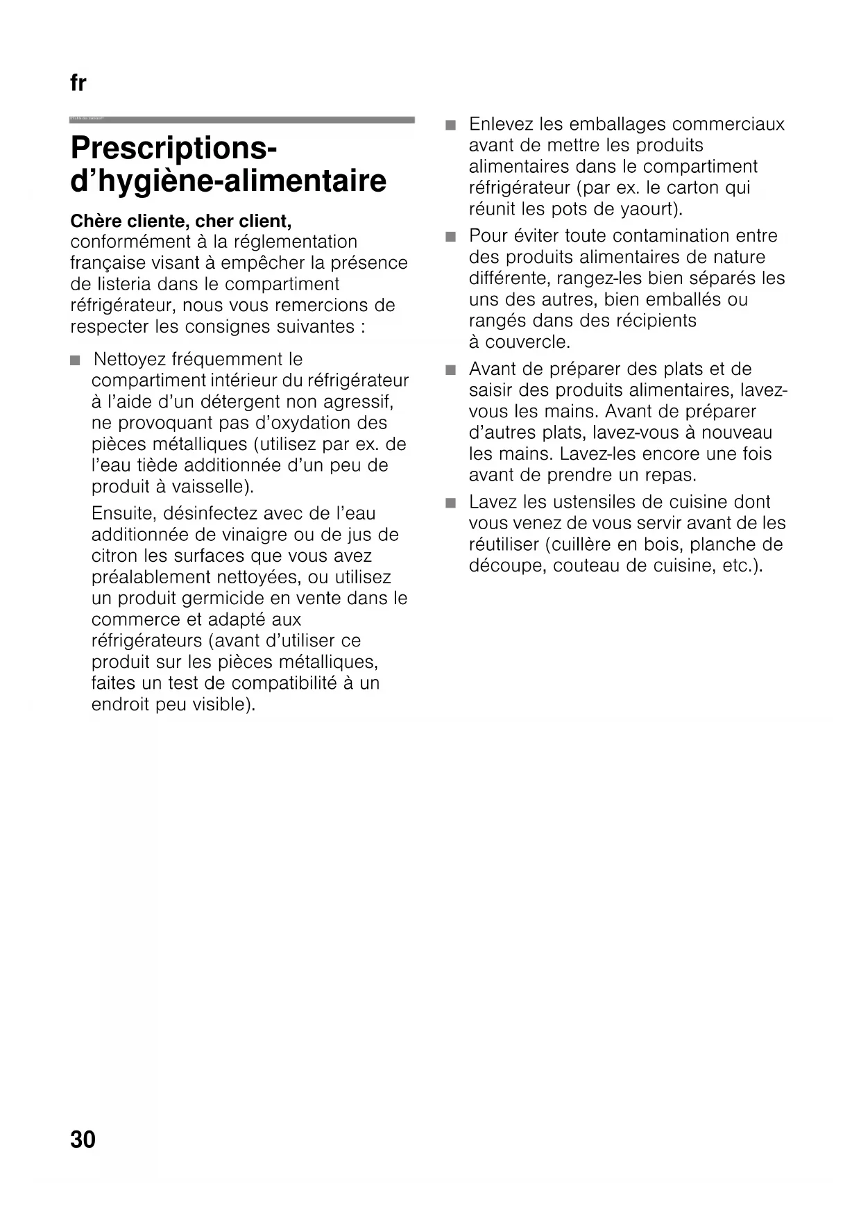 frTable des matières frMode d’emploi Prescriptions- d’hygiène-alimentaire Chère cliente, cher client, conformément à la réglementation française visant à empêcher la présence de listeria dans le compartiment réfrigérateur, nous vous remercions de respecter les consignes suivantes : ■ Nettoyez fréquemment le compartiment intérieur du réfrigérateur à l’aide d’un détergent non agressif, ne provoquant pas d’oxydation des pièces métalliques (utilisez par ex. de l’eau tiède additionnée d’un peu de produit à vaisselle). Ensuite, désinfectez avec de l’eau additionnée de vinaigre ou de jus de citron les surfaces que vous avez préalablement nettoyées, ou utilisez un produit germicide en vente dans le commerce et adapté aux réfrigérateurs (avant d’utiliser ce produit sur les pièces métalliques, faites un test de compatibilité à un endroit peu visible). ■ Enlevez les emballages commerciaux avant de mettre les produits alimentaires dans le compartiment réfrigérateur (par ex. le carton qui réunit les pots de yaourt). ■ Pour éviter toute contamination entre des produits alimentaires de nature différente, rangez-les bien séparés les uns des autres, bien emballés ou rangés dans des récipients à couvercle. ■ Avant de préparer des plats et de saisir des produits alimentaires, lavez- vous les mains. Avant de préparer d’autres plats, lavez-vous à nouveau les mains. Lavez-les encore une fois avant de prendre un repas. ■ Lavez les ustensiles de cuisine dont vous venez de vous servir avant de les réutiliser (cuillère en bois, planche de découpe, couteau de cuisine, etc.).fr