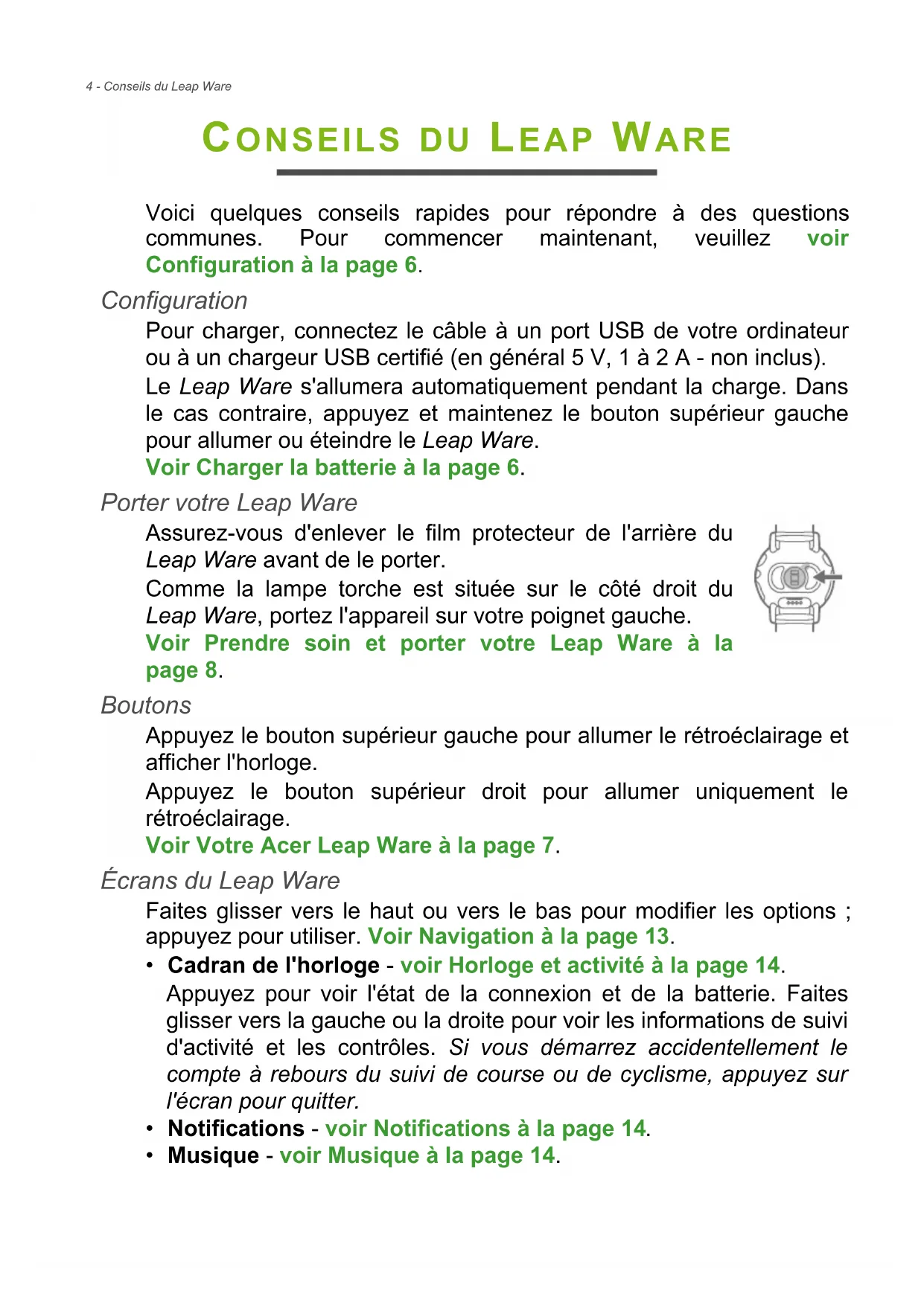 Voici quelques conseils rapides pour répondre à des questions communes. Pour commencer maintenant, veuillez voir Configuration à la page 6. Configuration Pour charger, connectez le câble à un port USB de votre ordinateur ou à un chargeur USB certifié (en général 5 V, 1 à 2 A - non inclus). Le Leap Ware s'allumera automatiquement pendant la charge. Dans le cas contraire, appuyez et maintenez le bouton supérieur gauche pour allumer ou éteindre le Leap Ware. Voir Charger la batterie à la page 6. Porter votre Leap Ware Assurez-vous d'enlever le film protecteur de l'arrière du Leap Ware avant de le porter. Comme la lampe torche est située sur le côté droit du Leap Ware, portez l'appareil sur votre poignet gauche. Voir Prendre soin et porter votre Leap Ware à la page 8. Boutons Appuyez le bouton supérieur gauche pour allumer le rétroéclairage et afficher l'horloge. Appuyez le bouton supérieur droit pour allumer uniquement le rétroéclairage. Voir Votre Acer Leap Ware à la page 7. Écrans du Leap Ware Faites glisser vers le haut ou vers le bas pour modifier les options ; appuyez pour utiliser. Voir Navigation à la page 13.