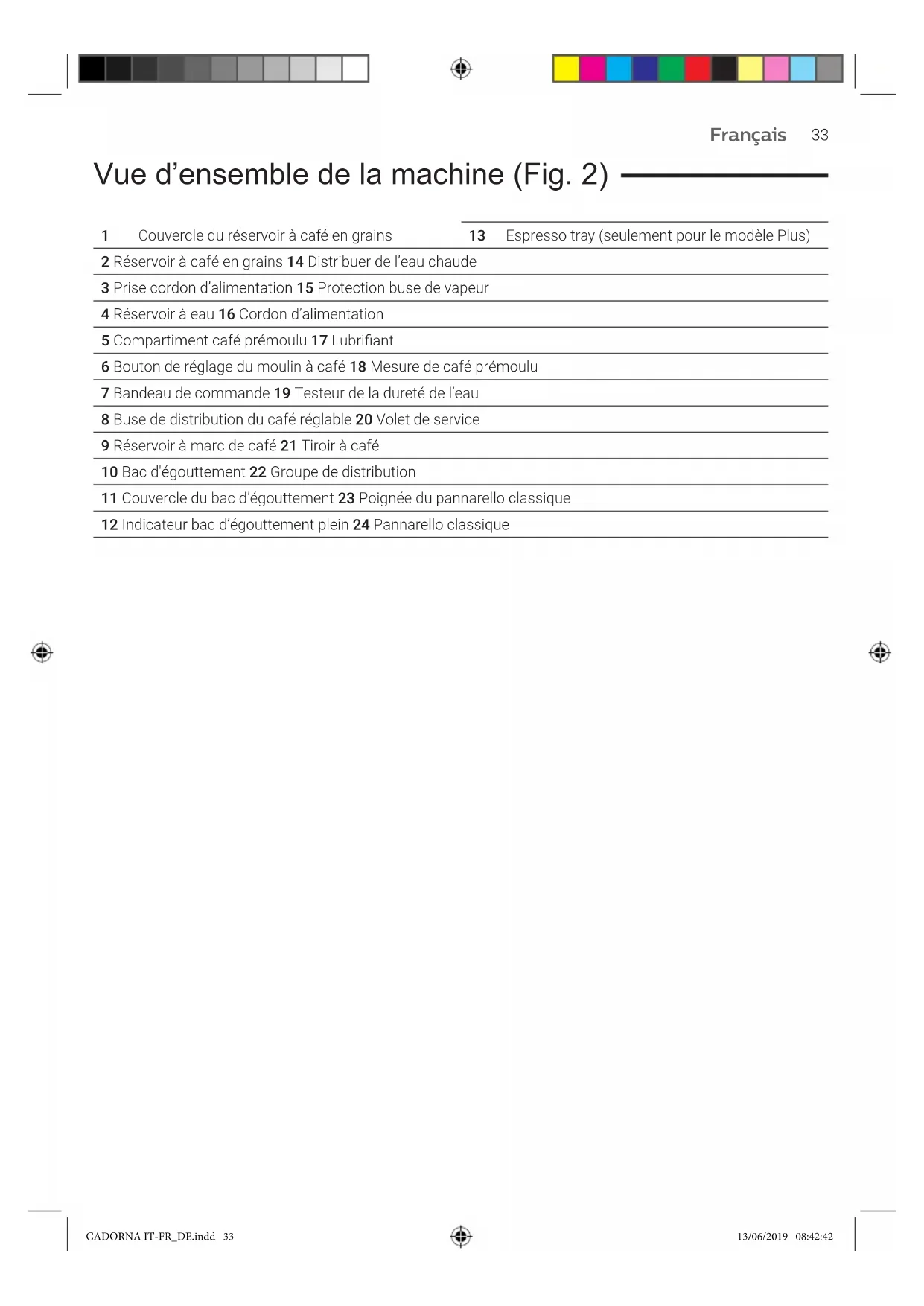 EAU». 3 Sélectionner «REMPLACER» pour changer le ltre ou «DÉSACTIVER» si on n’a pas l’intention d’utiliser le ltre. Appuyer sur la touche « » pour conrmer. Suivre les instructions achées pour activer correctement le ltre. START/STOP ON/OFF my favourites HOME clean/setting WATER FILTER REPLACE ACTIVATE DISABLE START/STOP ON/OFF my favourites HOME clean/setting Filter expired, replace or disable it CADORNA IT-FR_DE.indd 37 13/06/2019 08:42:4538 Français Types de boisson Nom de la boisson Description Ristretto Le ristretto, servi dans une petite tasse, est un espresso dont le temps de distribution est réduit par rapport à l’espresso classique; le café sera donc plus serré et moins riche en caféine. Espresso L’espresso est reconnu dans le monde entier comme étant le véritable «café italien». Servi dans une petite tasse, ses caractéristiques uniques sont un arôme rond et intense et une couche supérieure de crème naturelle compacte. Ce qu’on retrouve dans la tasse est le résultat d’un processus d’extraction par pression avec l’utilisation d’eau chaude, inventé par Achille Gaggia en 1938. Espresso lungo L’espresso lungo est un espresso ayant un temps d’extraction plus long. C’est un café plus dilué, ayant une intensité aromatique différente et une teneur en caféine plus élevée. Il est servi dans une tasse de taille moyenne. Café Le café est une boisson préparée avec une quantité d’eau plus grande par rapport à l’espresso. Son arôme est plus léger et il est servi dans une tasse de taille moyenne à grande. Americano L’americano est un café allongé moins intense préparé avec un espresso auquel on ajoute de l’eau chaude. Eau chaude L’eau chaude peut être utilisée pour préparer du thé, des tisanes et des boissons solubles. Espresso tray (seulement pour le modèle Cadorna Plus) Cette machine a été conçue pour garantir la préparation de boissons impeccables, qu’il s’agisse de l’espresso traditionnel ou de beaucoup d’autres boissons disponibles. Si vous souhaitez déguster un espresso italien comme le veut la tradition, avec une délicieuse couche de crème naturelle en surface, nous vous conseillons d’utiliser l’«Espresso tray», spéciquement conçu et intégré dans la machine. Cette plaque permet d’utiliser les petites tasses traditionnelles pour espresso, parce qu’elle garantit la hauteur parfaite pour obtenir une crème compacte et homogène ainsi qu’une distribution sans éclaboussures. CADORNA IT-FR_DE.indd 38 13/06/2019 08:42:4539 Français Distribution de café avec du café prémoulu Utiliser la mesure fournie en dotation pour verser la dose correcte dans le compartiment du café prémoulu. 1 Ouvrir le couvercle du compartiment du café prémoulu et ajouter une mesure rase de café prémoulu. Attention: ne pas verser de substances autres que du café prémoulu pour ne pas endommager la machine. 2 Mettre une tasse sous la buse de distribution du café et sélectionner la boisson souhaitée. 3 Le café souhaité ayant été sélectionné, appuyer sur la touche « » si on veut distribuer deux tasses simultanément (AMERICANO exclu). 2 Faire déles les pages pour trouver et sélectionner le café souhaité. 4 Enn, appuyer sur la touche START/STOP START/STOP pour commencer la distribution. Remarque: il est possible d’interrompre la distribution à tout moment, il sut d’appuyer sur la touche START/STOP START/STOP