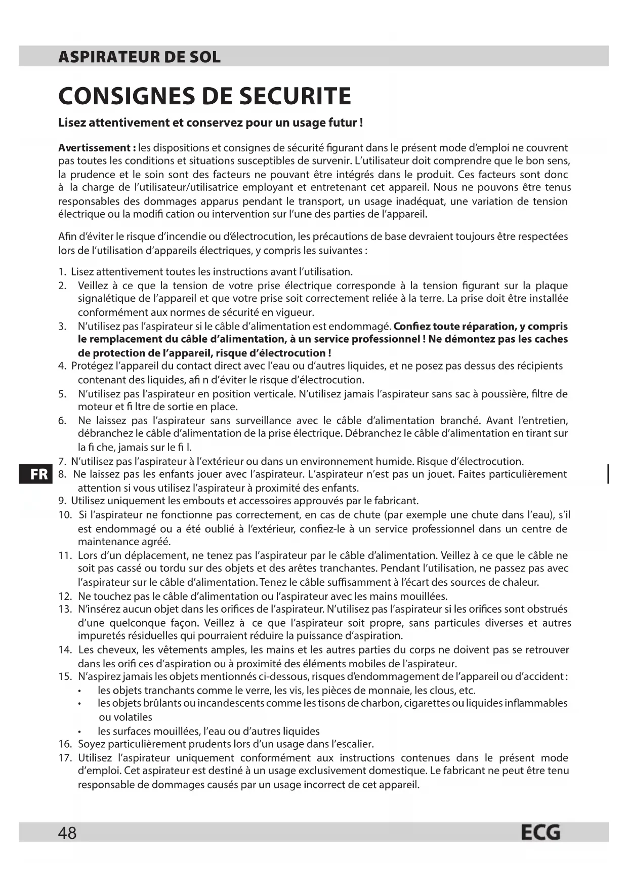d’emploi. Cet aspirateur est destiné àun usage exclusivement domestique. Le fabricant ne peut être tenu responsable de dommages causés par un usage incorrect de cet appareil.FR