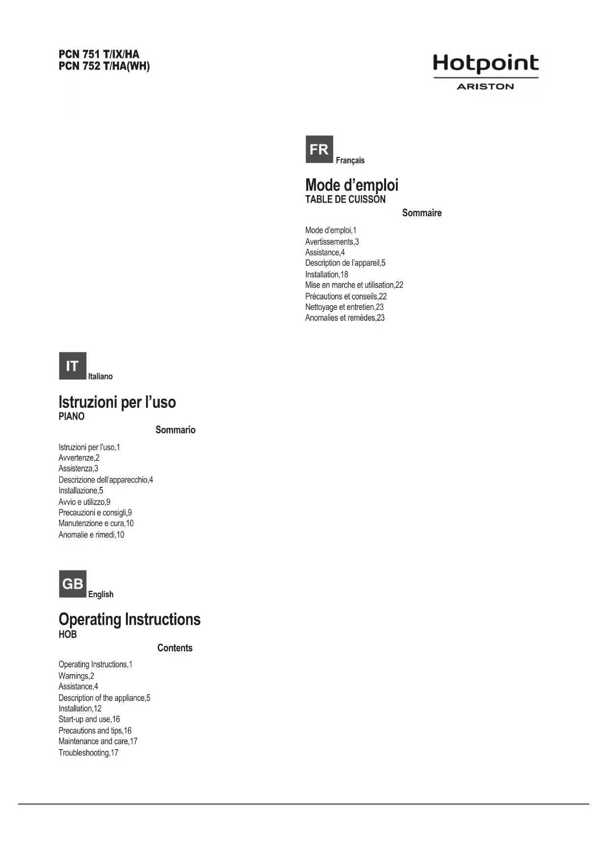 Retrouvez gratuitement la notice de l'appareil PCN 752 THA(WH) HOTPOINT ARISTON au format PDF.