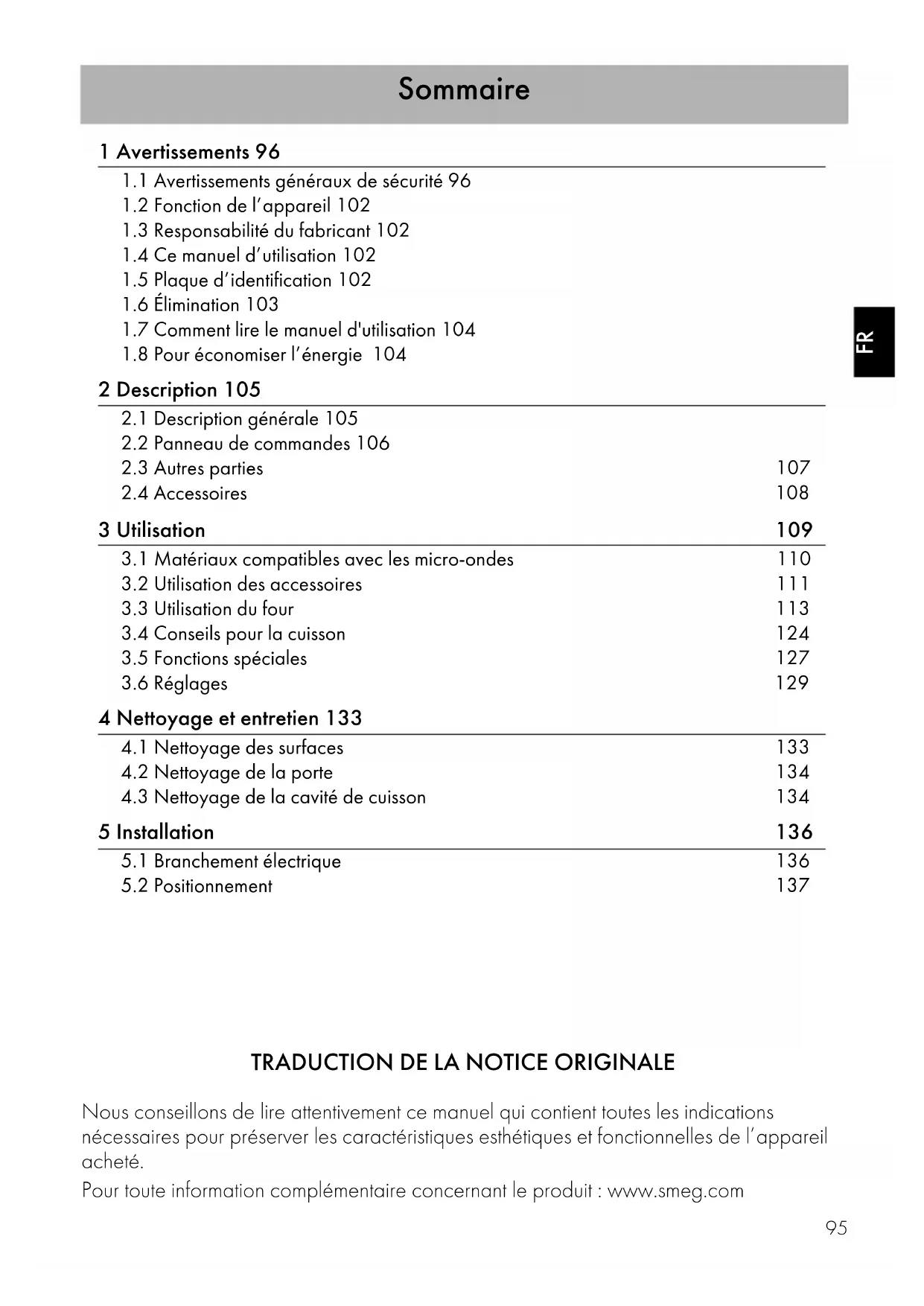 Nous conseillons de lire attentivement ce manuel qui contient toutes les indications nécessaires pour préserver les caractéristiques esthétiques et fonctionnelles de l’appareil acheté. Pour toute information complémentaire concernant le produit : www.smeg.com TRADUCTION DE LA NOTICE ORIGINALEAvertissements