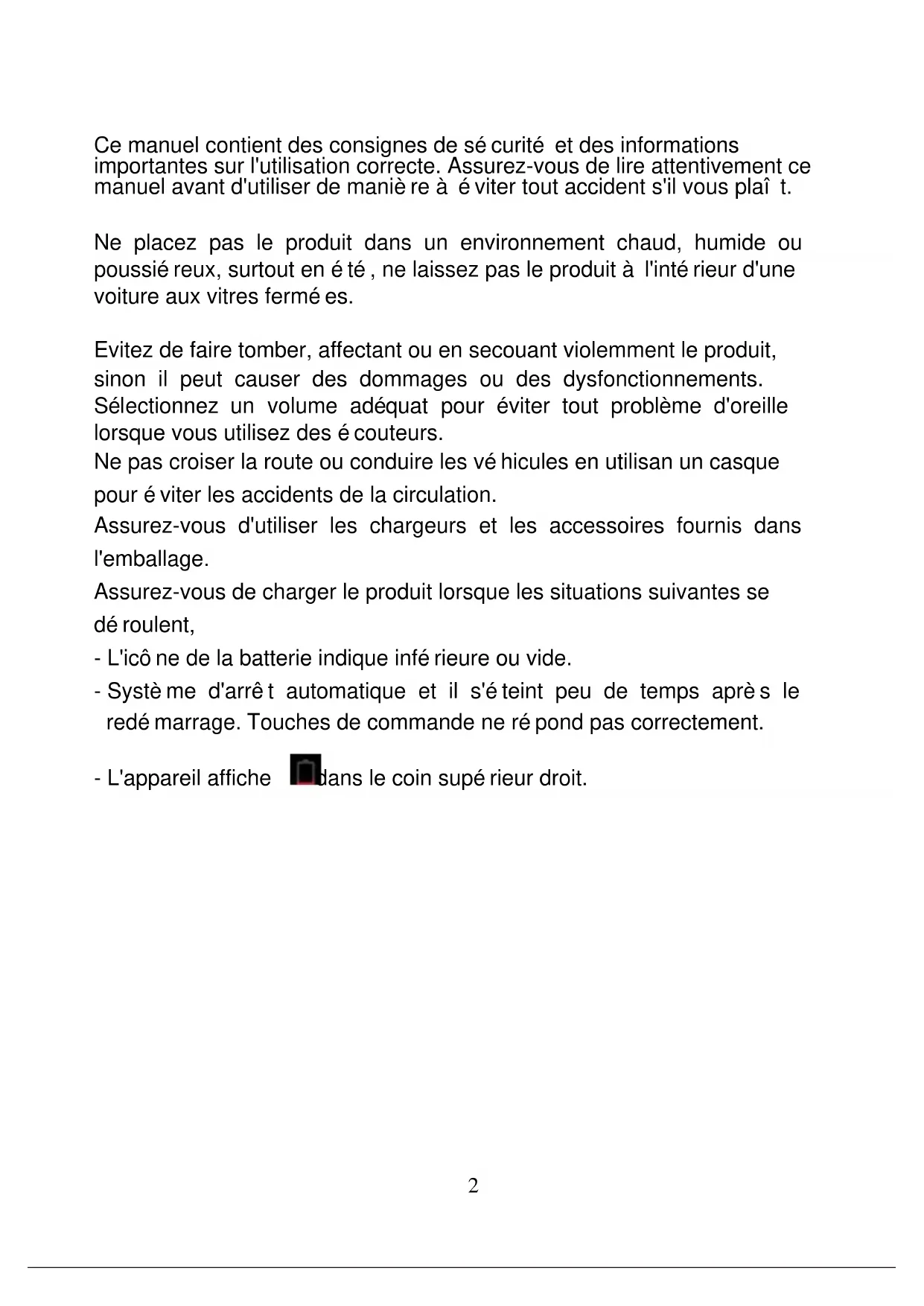 - Pour le chargement, assurez-vous d'utiliser l'adaptateur secteur (5V DC) qui est fourni dans le paquet, sinon, l'appareil peut etre endommagé et ne fonctionne pas.