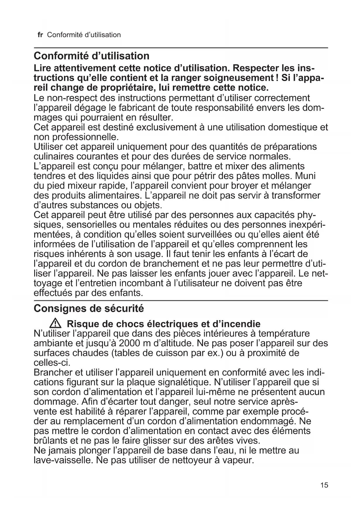 - reil change de propriétaire, lui remettre cette notice. Le non-respect des instructions permettant d’utiliser correctement l’appareil dégage le fabricant de toute responsabilité envers les dom- mages qui pourraient en résulter. Cet appareil est destiné exclusivement à une utilisation domestique et non professionnelle. Utiliser cet appareil uniquement pour des quantités de préparations culinaires courantes et pour des durées de service normales. L’appareil est conçu pour mélanger, battre et mixer des aliments tendres et des liquides ainsi que pour pétrir des pâtes molles. Muni du pied mixeur rapide, l’appareil convient pour broyer et mélanger des produits alimentaires. L’appareil ne doit pas servir à transformer d’autres substances ou objets. Cet appareil peut être utilisé par des personnes aux capacités phy- siques, sensorielles ou mentales réduites ou des personnes inexpéri- mentées, à condition qu’elles soient surveillées ou qu’elles aient été informées de l’utilisation de l’appareil et qu’elles comprennent les risques inhérents à son usage. Il faut tenir les enfants à l’écart de l’appareil et du cordon de branchement et ne pas leur permettre d’uti- liser l’appareil. Ne pas laisser les enfants jouer avec l’appareil. Le net- toyage et l’entretien incombant à l’utilisateur ne doivent pas être effectués par des enfants. Consignes de sécurité W Risque de chocs électriques et d’incendie N’utiliser l’appareil que dans des pièces intérieures à température ambiante et jusqu’à 2000 m d’altitude. Ne pas poser l’appareil sur des surfaces chaudes (tables de cuisson par ex.) ou à proximité de celles-ci. Brancher et utiliser l’appareil uniquement en conformité avec les indi- cations figurant sur la plaque signalétique. N’utiliser l’appareil que si son cordon d’alimentation et l’appareil lui-même ne présentent aucun dommage. Afin d’écarter tout danger, seul notre service après- vente est habilité à réparer l’appareil, comme par exemple procé- der au remplacement d’un cordon d’alimentation endommagé. Ne pas mettre le cordon d’alimentation en contact avec des éléments brûlants et ne pas le faire glisser sur des arêtes vives. Ne jamais plonger l’appareil de base dans l’eau, ni le mettre au lave-vaisselle. Ne pas utiliser de nettoyeur à vapeur.16 fr Consignes de sécurité Ne pas utiliser l’appareil avec les mains humides. Ne pas plonger l’appareil dans un liquide au-delà de la jonction entre l’appareil de base et l’accessoire mixeur rapide. L’appareil doit toujours être débranché du secteur, après chaque utilisation, lorsqu’il n’est pas sous surveillance, lorsqu’il doit être monté ou démonté, avant de le nettoyer et en cas de panne. W Risques de blessures ! Ne jamais raccorder l’appareil à des minuteries ou à des prises pouvant être commandées à distance. Si une coupure de courant se produit, l’appareil reste en position allumée et redémarrera dès le retour du courant. Éteindre l’appareil immédiatement. Toujours sur- veiller l’appareil pendant son fonctionnement ! Ne jamais laisser l’ap- pareil allumé plus longtemps que nécessaire au mixage des produits alimentaires. Une fois l’appareil utilisé, attendre l’arrêt de l’entraîne- ment. L’appareil doit être éteint et débranché du secteur avant de pro- céder au changement d’accessoires ou de pièces complémentaires mobiles en fonctionnement. Ne monter et détacher les accessoires qu’une fois l’appareil immobilisé. Après arrêt, l’appareil continue de tourner brièvement. Ne pas faire tourner l’appareil à vide. Ne pas toucher les pièces en rotation. Ne jamais approcher les doigts de la lame située dans le pied mixeur. Ne jamais nettoyer les lames avec les mains nues. Utiliser une brosse. Protéger les cheveux longs ou les vêtements flottants afin qu’ils ne se prennent pas dans les acces- soires en rotation. Utiliser l’appareil avec les pièces et accessoires d’origine uniquement. Utiliser uniquement des accessoires de même type par paire (p. ex. 2 x crochet pétrisseur). Ne jamais utiliser d’ac- cessoires tandis que d’autres sont présents dans l’orifice arrière. W Risque de brûlure ! Attention lors du mixage d’aliments chauds. Les aliments chauds peuvent gicler pendant le mixage. W Important ! Avant d’utiliser le pied mixeur rapide dans la casserole, retirer préalablement cette dernière du foyer de cuisson. Le bol mixeur ne va pas au four micro-ondes. Nettoyer l’appareil selon la description après chaque utilisation ou après une longue durée sans utilisation. X « Après le travail / Nettoyage » voir page 1817 fr Sommaire Vous venez d’acheter ce nouvel appa- reil Bosch et nous vous en félicitons cordialement. Sur notre site web, vous trouverez des informations avancées sur nos produits. Sommaire Conformité d’utilisation p. 15