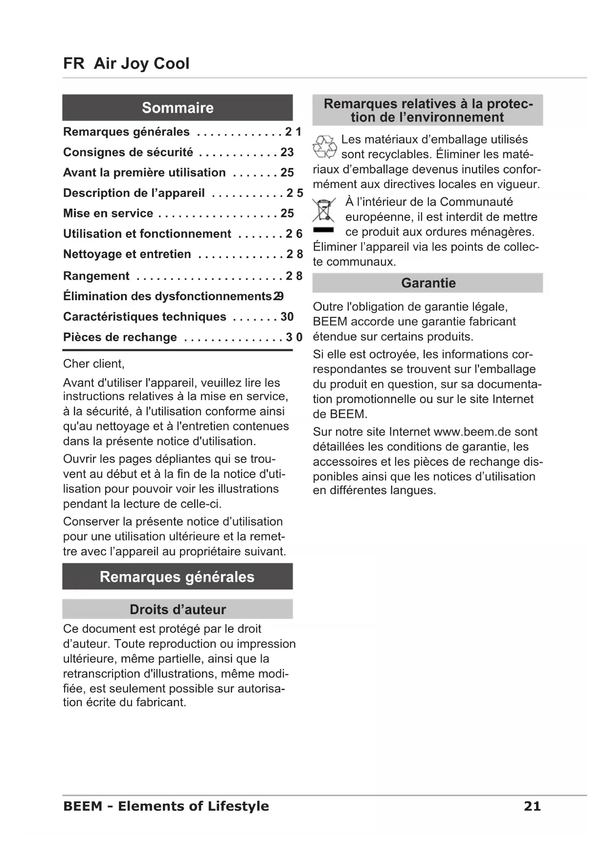 - numbering according to the description of the appliance21 FR Air Joy Cool BEEM - Elements of Lifestyle Cher client, Avant d'utiliser l'appareil, veuillez lire les instructions relatives à la mise en service, à la sécurité, à l'utilisation conforme ainsi qu'au nettoyage et à l'entretien contenues dans la présente notice d'utilisation. Ouvrir les pages dépliantes qui se trou- vent au début et à la n de la notice d'uti- lisation pour pouvoir voir les illustrations pendant la lecture de celle-ci. Conserver la présente notice d’utilisation pour une utilisation ultérieure et la remet- tre avec l’appareil au propriétaire suivant. Remarques générales Droits d’auteur Ce document est protégé par le droit d’auteur. Toute reproduction ou impression ultérieure, même partielle, ainsi que la retranscription d'illustrations, même modi- ée, est seulement possible sur autorisa- tion écrite du fabricant. Remarques relatives à la protec- tion de l’environnement Les matériaux d’emballage utilisés sont recyclables. Éliminer les maté- riaux d’emballage devenus inutiles confor- mément aux directives locales en vigueur. À l’intérieur de la Communauté européenne, il est interdit de mettre ce produit aux ordures ménagères. Éliminer l’appareil via les points de collec- te communaux. Garantie Outre l'obligation de garantie légale, BEEM accorde une garantie fabricant étendue sur certains produits. Si elle est octroyée, les informations cor- respondantes se trouvent sur l'emballage du produit en question, sur sa documenta- tion promotionnelle ou sur le site Internet de BEEM. Sur notre site Internet www.beem.de sont détaillées les conditions de garantie, les accessoires et les pièces de rechange dis- ponibles ainsi que les notices d’utilisation en différentes langues. Remarques générales .............21 Consignes de sécurité . . . . . . . . . . . . 23 Avant la première utilisation . . . . . . . 25 Description de l’appareil ...........25 Mise en service . . . . . . . . . . . . . . . . . . 25 Utilisation et fonctionnement .......26 Nettoyage et entretien .............28 Rangement ......................28 Élimination des dysfonctionnements . 29 Caractéristiques techniques . . . . . . . 30 Pièces de rechange ...............30 Sommaire22 Air Joy Cool FR BEEM - Elements of Lifestyle AVERTISSEMENT En cas d’utilisation non-conforme et/ou différente, l’appareil peut présenter des dangers. L'appareil doit être utilisé unique- ► ment de manière conforme. Respecter les procédures décrites ► dans la présente notice d’utilisation. Toutes réclamations pour cause de dom- mages survenus suite à une utilisation non-conforme sont exclues. L'utilisateur en assume seul les risques. Limite de responsabilité Nous n'assumons aucune responsabilité pour les dégâts ou dommages consécutifs en cas de : non-respect de la notice d'utilisation ; ■ utilisation non-conforme ; ■ manipulation non-conforme ou incor- ■ recte ; réparations effectuées de manière ■ inappropriée ; modications non-autorisées ; ■ utilisation de pièces et pièces de re- ■ change autres que celles du fabricant ; utilisation d'accessoires ou de pièces ■ complémentaires inappropriés. Déclaration de conformité Par la présente, la société BEEM déclare que cet appareil est conforme aux exigen- ces fondamentales et aux autres disposi- tions applicables des directives 2006/95/ CE et 2004/108/CE et 2009/125/CE. Symboles utilisés DANGER Est utilisé pour un danger imminent et menaçant pouvant occasionner des blessures graves voire mortelles. Pour prévenir ce risque, suivez les ► instructions indiquées ici. AVERTISSEMENT Est utilisé pour une situation potentielle- ment dangereuse pouvant occasionner des blessures graves ou mortelles. Pour prévenir ce risque, suivez les ► instructions indiquées ici. ATTENTION Est utilisé pour une situation potentielle- ment dangereuse pouvant occasionner des blessures légères ou des domma- ges matériels. Pour prévenir ce risque, suivez les ► instructions indiquées ici. REMARQUE Une remarque désigne les informa- ► tions supplémentaires facilitant le maniement de l'appareil. Utilisation conforme Cet appareil est principalement prévu pour une utilisation à caractère non commercial dans des locaux fermés pour générer un ux d'air réglable en continu. Toute autre utilisation ou toute utilisation sortant de ce cadre est considérée comme non-con- forme.23 FR Air Joy Cool BEEM - Elements of Lifestyle Consignes de sécurité Avant d'utiliser l’appareil, le contrôler ■ pour vérier qu'il ne présente aucun dommage apparent. Ne pas mettre en service un appareil endommagé. Cet appareil n'est pas destiné à être ■ utilisé par des personnes (y compris des enfants) ayant des capacités physiques, sensorielles ou mentales restreintes, trop peu d'expérience et/ou de connaissances, à moins d'être sous la surveillance d'une personne respon- sable de leur sécurité ou de recevoir des instructions de cette dernière sur le mode d'utilisation de l'appareil. Il convient de surveiller les enfants an ■ de s'assurer qu'ils ne jouent pas avec l'appareil. Ranger l'appareil hors de portée des ■ enfants. Ne faire réparer l’appareil que par un ■ vendeur spécialisé agréé ou par le ser- vice après-vente de l’usine. Ceci vaut tout particulièrement pour le remplace- ment d’un câble d’alimentation endom- magé. Des réparations inappropriées peuvent entraîner des risques consi- dérables pour l'utilisateur. De plus, la garantie perd toute validité. Pendant la période de garantie, toute ■ réparation de l’appareil doit unique- ment être effectuée par un service après-vente agréé par le fabricant, faute de quoi les droits à la garantie perdent leur validité en cas de dom- mages et de dysfonctionnements en résultant. Les composants défectueux doivent ■ uniquement être remplacés par 