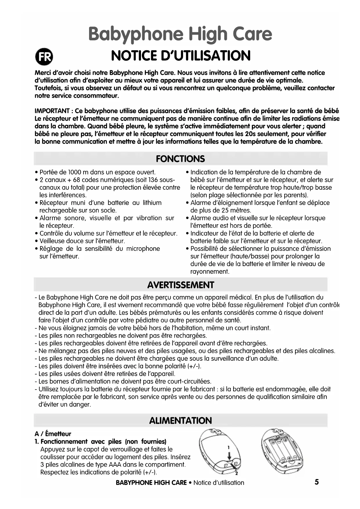 AVERTISSEMENT - Le Babyphone High Care ne doit pas être perçu comme un appareil médical. En plus de l’utilisation duBabyphone High Care, il est vivement recommandé que votre bébé fasse régulièrement l’objet d’un contrôledirect de la part d’un adulte. Les bébés prématurés ou les enfants considérés comme à risque doiventfaire l’objet d’un contrôle par votre pédiatre ou autre personnel de santé.- Ne vous éloignez jamais de votre bébé hors de l’habitation, même un court instant.- Les piles non rechargeables ne doivent pas être rechargées.- Les piles rechargeables doivent être retirées de l’appareil avant d’être rechargées.- Ne mélangez pas des piles neuves et des piles usagées, ou des piles rechargeables et des piles alcalines.- Les piles rechargeables ne doivent être chargées que sous la surveillance d’un adulte.- Les piles doivent être insérées avec la bonne polarité (+/-).- Les piles usées doivent être retirées de l’appareil.- Les bornes d’alimentation ne doivent pas être court-circuitées.- Utilisez toujours la batterie du récepteur fournie par le fabricant : si la batterie est endommagée, elle doitêtre remplacée par le fabricant, son service après vente ou des personnes de qualification similaire afind’éviter un danger. ALIMENTATION A / Émetteur1. Fonctionnement avec piles (non fournies)Appuyez sur le capot de verrouillage et faites lecoulisser pour accéder au logement des piles. Insérez3 piles alcalines de type AAA dans le compartiment.Respectez les indications de polarité (+/-). Babyphone High Care