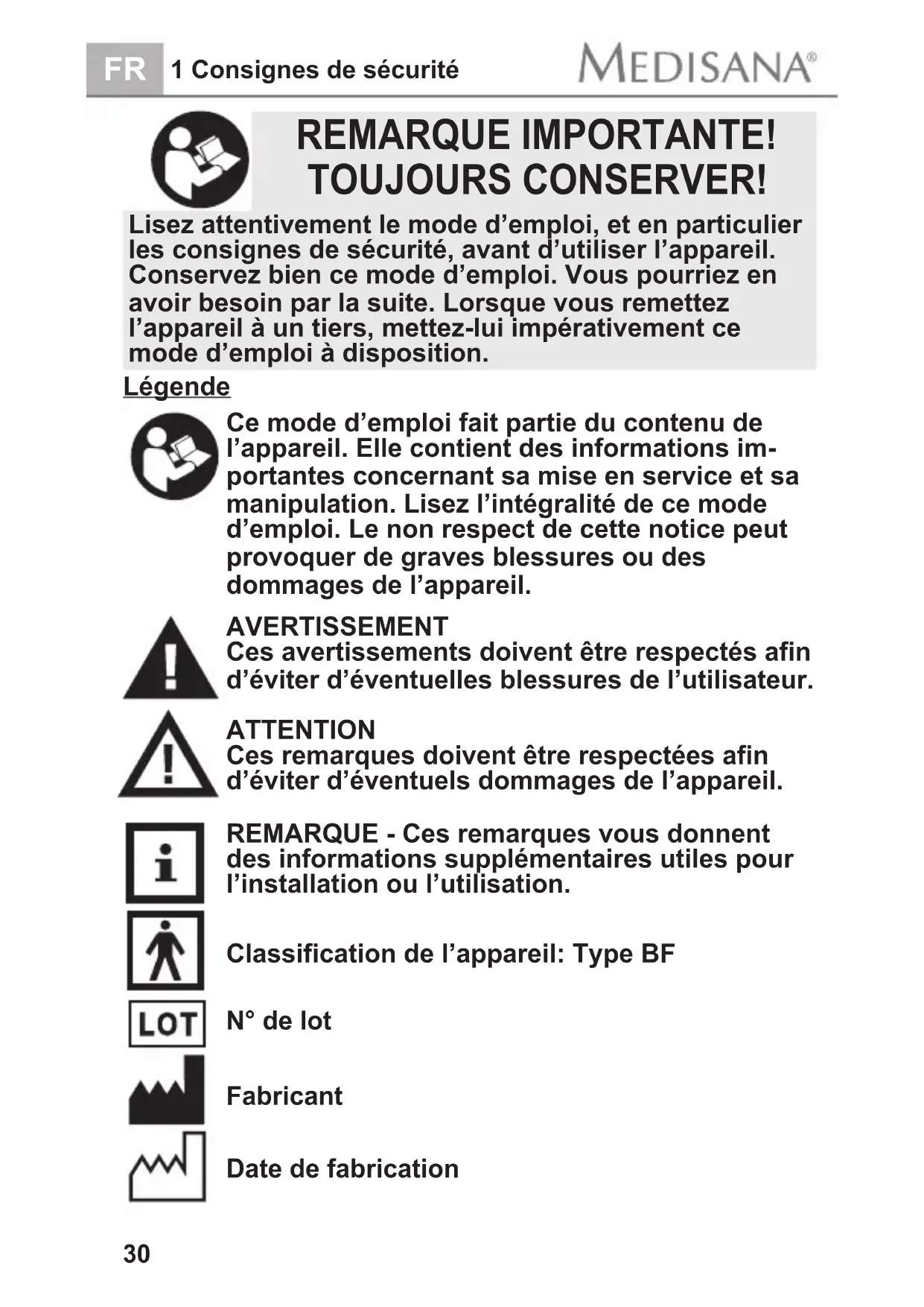 7 Warranty 29Ce mode d’emploi fait partie du contenu de l’appareil. Elle contient des informations im- portantes concernant sa mise en service et sa manipulation. Lisez l’intégralité de ce mode d’emploi. Le non respect de cette notice peut provoquer de graves blessures ou des dommages de l’appareil. AVERTISSEMENT Ces avertissements doivent être respectés afin d’éviter d’éventuelles blessures de l’utilisateur. ATTENTION Ces remarques doivent être respectées afin d’éviter d’éventuels dommages de l’appareil. REMARQUE - Ces remarques vous donnent des informations supplémentaires utiles pour l’installation ou l’utilisation. Légende N° de lot Fabricant REMARQUE IMPORTANTE! TOUJOURS CONSERVER! Lisez attentivement le mode d’emploi, et en particulier les consignes de sécurité, avant d’utiliser l’appareil. Conservez bien ce mode d’emploi. Vous pourriez en avoir besoin par la suite. Lorsque vous remettez l’appareil à un tiers, mettez-lui impérativement ce mode d’emploi à disposition. Classification de l’appareil: Type BF Date de fabrication