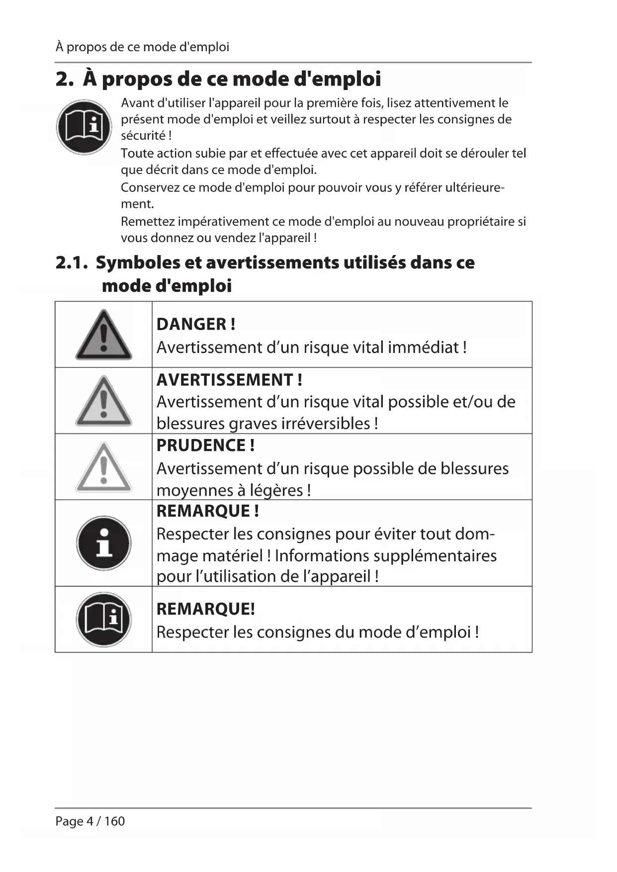 Avant d'utiliser l'appareil pour la première fois, lisez attentivement le présent mode d'emploi et veillez surtout à respecter les consignes de sécurité ! Toute action subie par et effectuée avec cet appareil doit se dérouler tel que décrit dans ce mode d'emploi. Conservez ce mode d'emploi pour pouvoir vous y référer ultérieure- ment. Remettez impérativement ce mode d'emploi au nouveau propriétaire si vous donnez ou vendez l'appareil ! 2.1. Symboles et avertissements utilisés dans ce mode d'emploi DANGER! Avertissement d’un risque vital immédiat ! AVERTISSEMENT! Avertissement d’un risque vital possible et/ou de blessures graves irréversibles ! PRUDENCE! Avertissement d’un risque possible de blessures moyennes à légères ! REMARQUE! Respecter les consignes pour éviter tout dom- mage matériel ! Informations supplémentaires pour l’utilisation de l’appareil ! REMARQUE! Respecter les consignes du mode d’emploi ! 16600 FR Auchan FR Content MSN 5005 1153 final.indb 416600 FR Auchan FR Content MSN 5005 1153 final.indb 4 29.07.2015 13:42:5429.07.2015 13:42:54Page 5 / 160 À propos de ce mode d'emploi