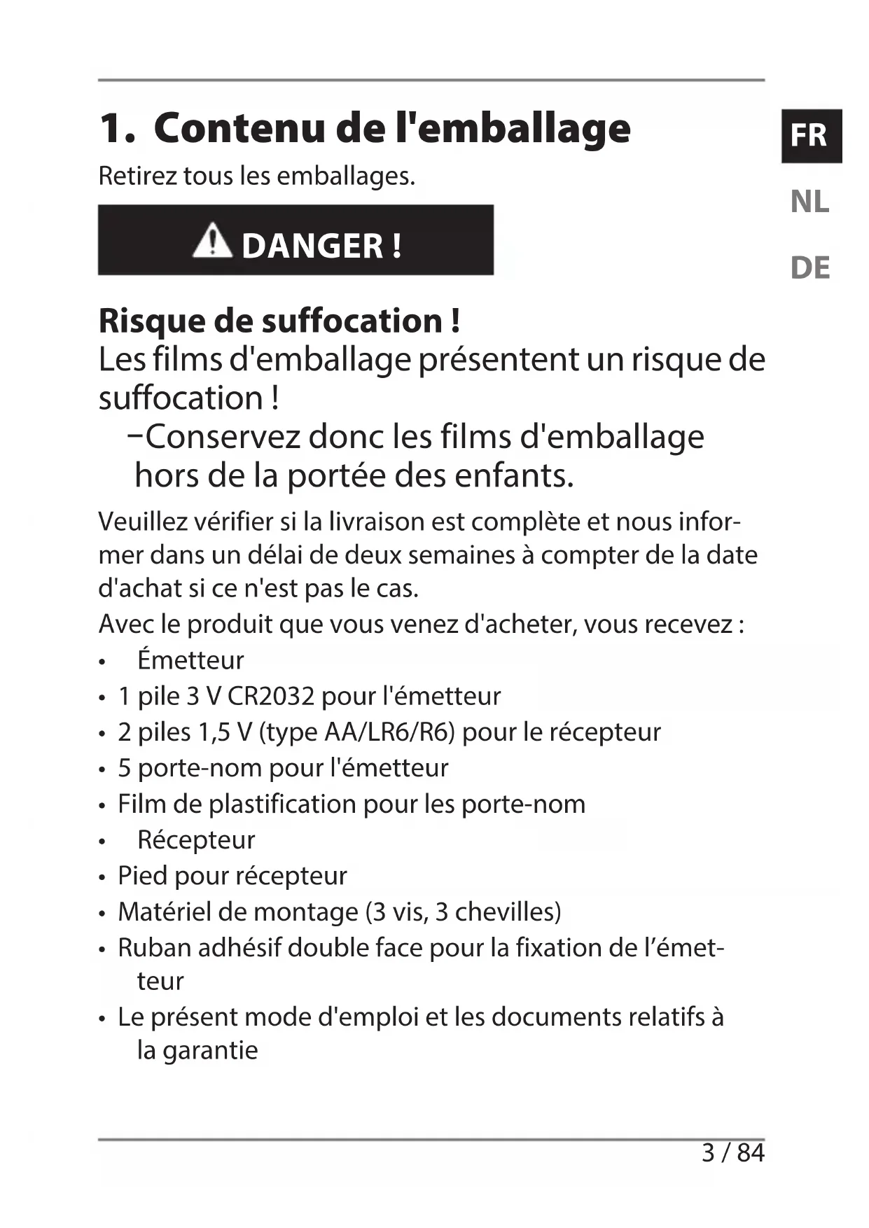 Retirez tous les emballages. DANGER! Risque de suffocation! Les films d'emballage présentent un risque de suffocation ! − Conservez donc les films d'emballage hors de la portée des enfants. Veuillez vérifier si la livraison est complète et nous infor- mer dans un délai de deux semaines à compter de la date d'achat si ce n'est pas le cas. Avec le produit que vous venez d'acheter, vous recevez: