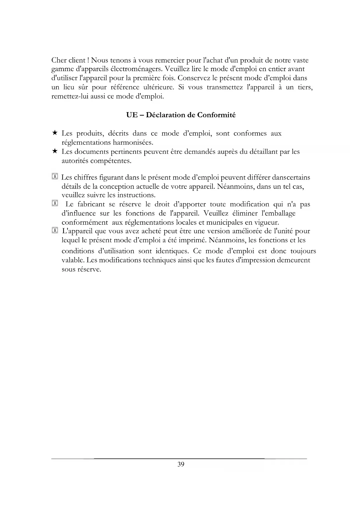 Cher client ! Nous tenons à vous remercier pour l'achat d'un produit de notre vaste gamme d'appareils électroménagers. Veuillez lire le mode d'emploi en entier avant d'utiliser l'appareil pour la première fois. Conservez le présent mode d’emploi dans un lieu sûr pour référence ultérieure. Si vous transmettez l'appareil à un tiers, remettez-lui aussi ce mode d'emploi. UE – Déclaration de Conformité