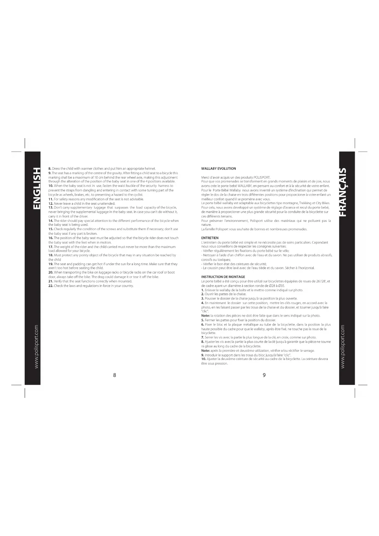 ENGLISH WALLABY EVOLUTION Merci d’avoir acquis un des produits POLISPORT. Pour que vos promenades se transforment en grands moments de plaisirs et de joie, nous avons crée le porte bebé WALLABY, en pensant au confort et à la sécurité de votre enfant. Pour le Porte Bébé Wallaby nous avons inventé un système d’inclination qui permet de règler le dos de la chaise en trois diérentes positions pour proporcioner à votre enfant un meilleur confort quand il se promène avec vous. Le porte bébé wallaby est adaptable aux bicyclettes tipe montagne, Trekking et City Bikes. Pour cela, nous avons developpé un système de règlage d’avance et recul du porte bebé, de manière à proporcioner une plus grande sécurité pour la conduite de la bicyclette sur ces diérents terrains. Pour préserver l’environnement, Polisport utilise des matériaux qui ne polluent pas la nature. La famille Polisport vous souhaite de bonnes et nombreuses promenades. ENTRETIEN L’entretien du porte bébé est simple et ne nécessite pas de soins particuliers. Cependant nous vous conseillons de respecter les consignes suivantes: - Vérier régulièrement les xations du porte bébé sur le vélo; - Nettoyer à l’aide d’un chion avec de l’eau et du savon. Ne pas utiliser de produits abrasifs, corosifs ou toxiques; - Vérier le bon état des ceintures de sécurité; - Le coussin peut être lavé avec de l’eau tiède et du savon. Sécher à l’horizontal.