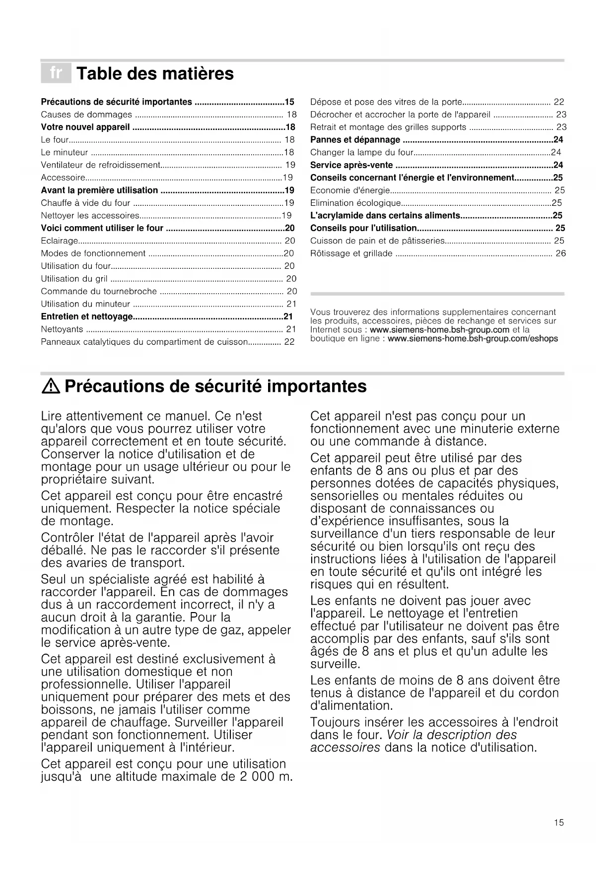 B 070 222 142 FR 01 40 10 12 00 CH 0848 840 04025 Conseils concernant l'énergie et l'environnement Vous trouverez ici des conseils comment vous pouvez économiser de l'énergie lors de la cuisson et comment correctement éliminer votre appareil. Economie d'énergie ■ Préchauffez le four uniquement si cela est indiqué dans la recette. ■ Pendant la cuisson ou le rôtissage, ouvrez la porte du four le moins souvent possible. ■ Si vous voulez faire cuire plusieurs gâteaux, faitesles cuire les uns après les autres. Le four étant encore chaud. Le temps de cuisson est alors réduit pour le deuxième gâteau. Vous pouvez également enfourner 2 moules à cake l'un à côté de l'autre. ■ Si les temps de cuisson sont assez longs, vous pouvez éteindre le four 10 minutes avant la fin de la durée impartie puis terminez la cuisson avec la chaleur résiduelle. Elimination écologique L'acrylamide dans certains aliments L'acrylamide se forme avant tout en cas de produits céréaliers et de pommes de terre cuits à haute température, tels que chips, frites, toast, petits pains, pain ou pâtisseries fines (biscuits, pain d'épices, speculoos). Conseils pour l'utilisation Vous trouverez ici des conseils concernant les récipients et la préparation. Remarques ■ Utilisez les accessoires livrés avec l'appareil. Des accessoires supplémentaires sont en vente dans le commerce spécialisé ou auprès du service après-vente comme accessoires optionnels. Avant l'utilisation, retirez du compartiment de cuisson tous les accessoires et récipients qui ne sont pas nécessaires. ■ Utilisez toujours des maniques pour retirer des accessoires ou récipients chauds du compartiment de cuisson. Cuisson de pain et de pâtisseries Moules ■ Utilisez avant tout des moules ou plaques à pâtisserie de couleur claire. ■ Placez toujours les moules à gâteaux au centre de la grille. Eliminez l'emballage en respectant l'environnement. Cet appareil est marqué selon la directive européenne 2012/19/UE relative aux appareils électriques et électroniques usagés (waste electrical and electronic equipment - WEEE). La directive définit le cadre pour une reprise et une récupération des appareils usagés applicables dans les pays de la CE. Conseils pour la préparation de plats avec une faible formation d'acrylamide De manière générale ■ Les temps de cuisson doivent être aussi courts que possible. ■ Faites uniquement dorer les aliments, sans trop les faire dorer. ■ Un aliment gros et épais contient moins d'acrylamide. Cuisson de pâtisseries max. 200 °C. Petits gâteaux secs max. 190 °C. Des œufs ou des jaunes d'œuf réduisent la formation d'acrylamide. Frites au four Les répartir uniformément et en une seule couche sur la plaque. Faites cuire au moins 400 g par plaque, afin que les frites ne se dessèchent pas26 Conseils pour la pâtisserie Rôtissage et grillade Récipients Vous pouvez utiliser tout récipient résistant à la chaleur. Placez toujours le plat au centre de la grille. La plaque à pâtisserie émaillée est également appropriée pour des gros rôtis. Conseils pour les rôtis ■ Une température plus basse permet d'obtenir des mets plus uniformément dorés. ■ Versez 2 à 3 cuillerées à soupe de liquide sur la viande maigre et 8 à 10 cuillerées à soupe sur les rôtis à braiser, selon leur taille. ■ Pour les canards ou les oies, piquez la peau sous les ailes afin que la graisse puisse s'écouler. ■ Pour obtenir une peau de volaille dorée et croustillante, enduisez la peau de beurre ou versez de l'eau salée ou du jus d'orange sur la peau vers la fin de la cuisson. ■ Retournez les pièces de viande à micuisson. ■ Une fois le rôti cuit, laissez-le reposer 10 minutes de plus dans le four éteint et fermé. Cela permet au jus de rôti de mieux se répartir. ■ Lors du rôtissage de gros morceaux de viande une plus forte formation de vapeur peut se produire et se condenser sur la porte du four. C'est un phénomène normal qui n'a aucune influence sur le bon fonctionnement. Après la cuisson, essuyez la porte du four et la vitre avec un chiffon. ■ Si vous faites des grillades sur la grille, enfournez en plus la plaque à pâtisserie émaillée au niveau 1 pour récupérer la graisse. Conseils pour les grillades ■ Prenez si possible des pièces à griller de la même épaisseur. Elles doivent faire au moins 2 à 3 cm d'épaisseur. Elles seront alors uniformément dorées et bien juteuses. ■ Placez les pièces à griller au centre de la grille. Versez un peu d'eau sur la plaque à pâtisserie émaillée et enfournez-la en plus sous la grille, afin de récupérer la graisse. Ne la placez jamais sur la sole du compartiment de cuisson. ■ Badigeonnez les pièces à griller d'un peu d'huile, avant de les placer sur la grille sous le gril. ■ Retournez à mi-cuisson les pièces peu épaisses, retournez les pièces épaisses plusieurs fois pendant le temps de cuisson. Utilisez pour cela une pince à grillade, les pièces à griller ne seront ainsi pas transpercées et le jus de viande restera p.ex. dans le rôti. ■ Des types de viande rouge telle que de l'agneau et du bœuf brunissent davantage et plus rapidement que de la viande blanche telle que du porc et du veau. Conseils pour le tournebroche ■ Embrochez le rôti sur le tournebroche en le centrant le mieux possible et fixez-le aux deux extrémités avec les crochets. ■ De plus, vous pouvez fixer le rôti avec du fil de cuisine. En cas de volaille, fixez les extrémités des ailes sous le dos et les cuisses au corps. De cette sorte, elles ne brunissent pas trop. Piquez la peau sous les ailes afin que la graisse puisse s'écouler. Vérifiez si votre cake est complètement cuit. A l'aide d'un bâtonnet en bois, piquez le sommet du gâteau environ 10 minutes avant la fin du temps de cuisson indiqué dans la recette. Le gâteau est cuit si la pâte n'adhère plus au bâtonnet. Le gâteau s'affaisse. La fo