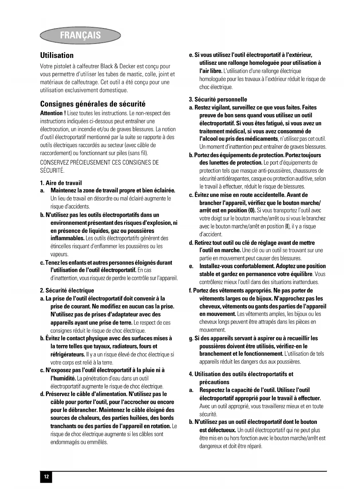 LpA (pression sonore) 61,6 dB(A), LWA (puissance acoustique) 72,6 dB(A), vibration pondérée sur la main/le bras : 0,18 m/s2, Kpa (incertitude de la pression sonore) 3 dB(A), Kwa (incertitude de la puissance acoustique 3 dB(A), Kevin Hewitt Directeur Ingénierie Client Spennymoor, County Durham DL16 6JG, Royaume-Uni 06-12-2006 Garantie Black & Decker vous assure la qualité de ses produits et vous offre une garantie très étendue. Ce certificat de garantie est un document supplémentaire et ne peut en aucun cas se substituer à vos droits légaux. La garantie est valable sur tout le territoire des États Membres de l'Union Européenne et de la Zone de Libre Échange Européenne. Si un produit Black & Decker s'avère défectueux en raison de matériaux en mauvais état, d'une erreur humaine, ou d'un manque de conformité dans les 24 mois suivant la date d'achat, Black & Decker garantit le remplacement des pièces défectueuses, la réparation des produits usés ou cassés ou remplace ces produits à la convenance du client, sauf dans les circonstances suivantes : 8 Le produit a été utilisé dans un but commercial, professionnel, ou a été loué. 8 Le produit a été mal utilisé ou avec négligence. 8 Le produit a subi des dommages à cause de corps étrangers, de substances ou d'accidents. 8 Des réparations ont été tentées par des techniciens ne faisant pas partie du service technique de Black & Decker. Pour avoir recours à la garantie, il est nécessaire de fournir une preuve d'achat au vendeur ou à un réparateur agréé. Pour connaître l'adresse du réparateur agréé le plus proche de chez vous, contactez le bureau Black & Decker à l'adresse indiquée dans ce manuel. Vous pourrez aussi trouver une liste de réparateurs agréés de Black & Decker et de plus amples détails concernant notre service après-vente sur le site Internet : www.2helpU.com Visitez notre site Web www.blackanddecker.fr pour enregistrer votre nouveau produit Black & Decker et être informé des nouveaux produits et des offres spéciales. Pour plus d'informations concernant la marque Black & Decker et notre gamme de produits, consultez notre site www.blackanddecker.fr. CG100 Tension V c.c. 6 Aucune vitesse de charge mm/min 90 - 150 Piles Type LR06 (AA) Poids g 95016 ITALIANO Italiano Uso previsto La pistola per tubi Black & Decker è stata progettata per facilitare l’applicazione di materiali adesivi, sigillanti, per calafataggio e stucchi contenuti in tubi. L'elettroutensile non è destinato all'utilizzo professionale. Norme generiche di sicurezza Attenzione! Leggere tutte le istruzioni. La mancata osservanza delle presenti istruzioni potrebbe causare scosse elettriche, incendi e/o infortuni gravi. Il termine "elettroutensile" che ricorre in tutte le avvertenze seguenti si riferisce ad utensili elettrici con o senza filo. CONSERVARE QUESTE ISTRUZIONI.