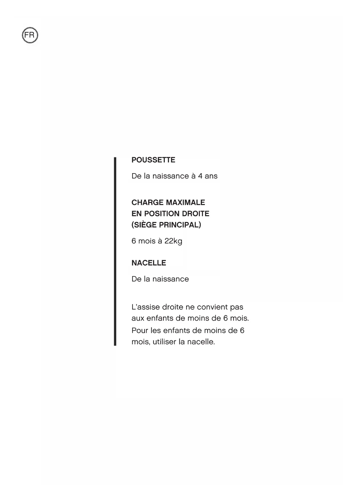 - Cette poussette est conçue pour des enfants de la naissance à 4 ans. Utilisation du siège principal: 6 mois à 22kg. Utilisation dans la nacelle: nouveau-né à 9kg. La nacelle est recommandée pour les nouveaux- nés. • La nacelle ne doit pas être utilisée si l’enfant est capable de s’asseoir tout seul, se retourner et se mettre à quatre pattes. Poids maximum de l’enfant la nacelle: 9kg. • L’assise droite ne convient pas aux enfants de moins de 6 mois. • La poussette ne peut transporter plus de 1 enfant. • Ne jamais laisser un enfant sans surveillance. • Toujours utiliser le système de retenue. • N'utilisez pas de pièces de rechange ou d'accessoires autres que ceux approuvés par le fabricant ou le distributeur. • Ne pas ajouter de matelas35