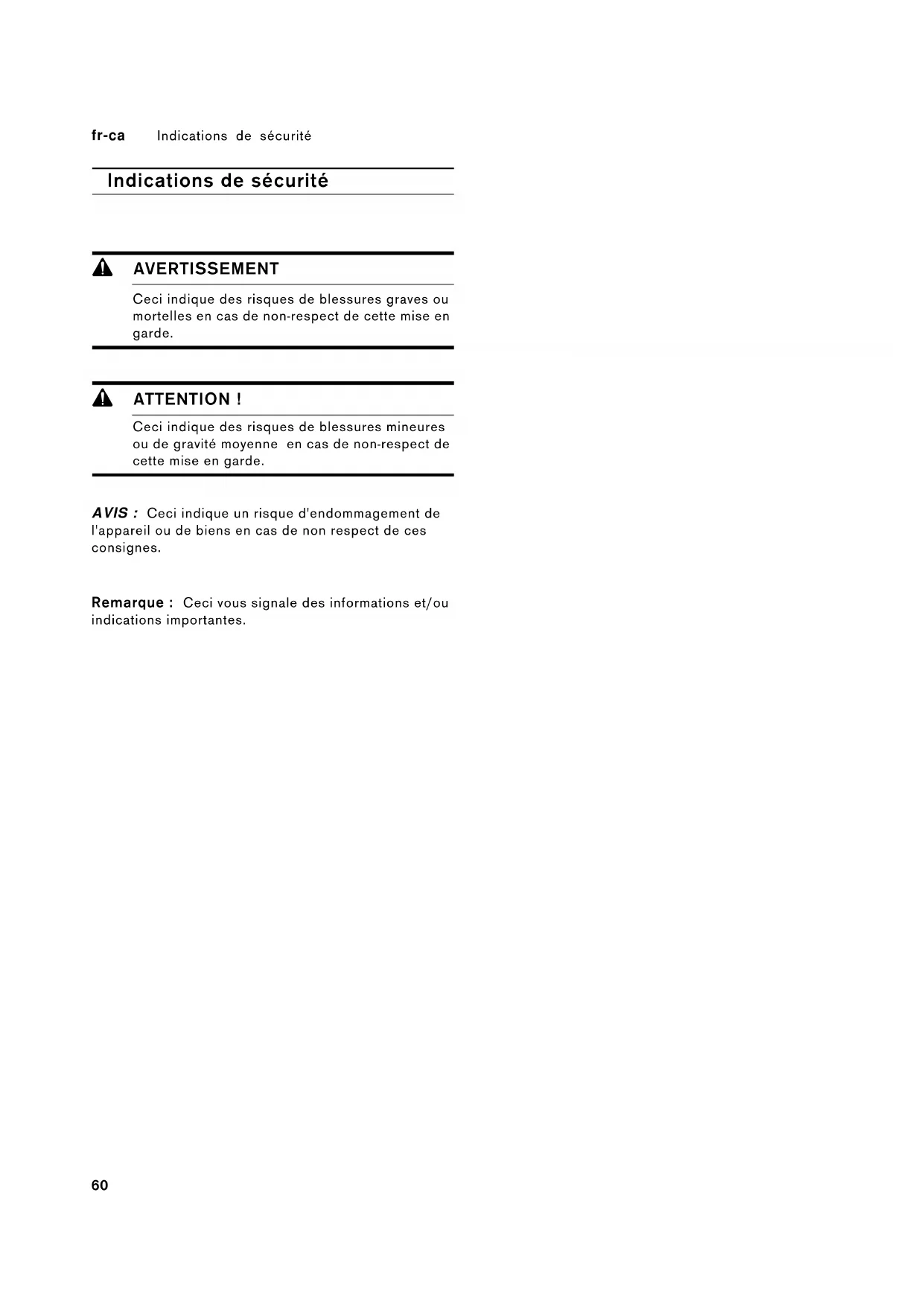 Indications de sécurité Indicati ons de sécuri té 9 AVERTISSEMENT Ceci indique des risques de blessures graves ou mortelles en cas de non-respect de cette mise en garde. 9 ATTENTION ! Ceci indique des risques de blessures mineures ou de gravité moyenne en cas de non-respect de cette mise en garde. AVIS : Ceci indique un risque d'endommagement de l'appareil ou de biens en cas de non respect de ces consignes. Remarque : Ceci vous signale des informations et/ou indications importantes.9 CONSIGNES DE SÉCURITÉ IMPORTANTES