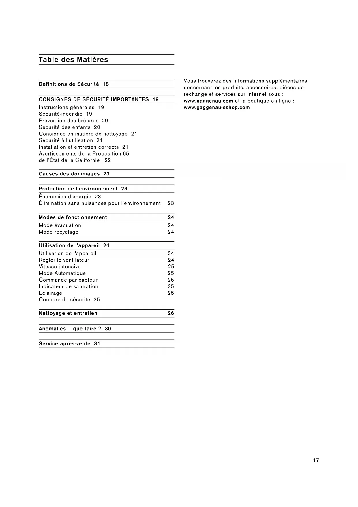 Instructions générales 19 Sécurité-incendie 19 Prévention des brûlures 20 Sécurité des enfants 20 Consignes en matière de nettoyage 21 Sécurité à l'utilisation 21 Installation et entretien corrects 21 Avertissements de la Proposition 65 de l’État de la Californie 22 Causes des dommages 23 Protection de l'environnement 23 Économies d'énergie 23 Élimination sans nuisances pour l'environnement 23 Modes de fonctionnement 24 Mode évacuation 24 Mode recyclage 24 Utilisation de l'appareil 24 Utilisation de l'appareil 24 Régler le ventilateur 24 Vitesse intensive 25 Mode Automatique 25 Commande par capteur 25 Indicateur de saturation 25 Éclairage 25 Coupure de sécurité 25 Nettoyage et entretien 26 Anomalies – que faire ? 30 Service après-vente 31 Vous trouverez des informations supplémentaires concernant les produits, accessoires, pièces de rechange et services sur Internet sous : www.gaggenau.com et la boutique en ligne : www.gaggenau-eshop.com18 Définitions de Sécurité 9 AVERTISSEMENT Le non-respect de cet avertissement peut entraîner la mort ou des blessures graves. 9 ATTENTION Le non-respect de cet avertissement peut entraîner des blessures mineures ou modérées. AVIS : Vous indique que des dommages à l'appareil ou aux biens peuvent survenir si vous ne respectez pas cet avertissement. Remarque : Vous signale des informations importantes ou des conseils.19