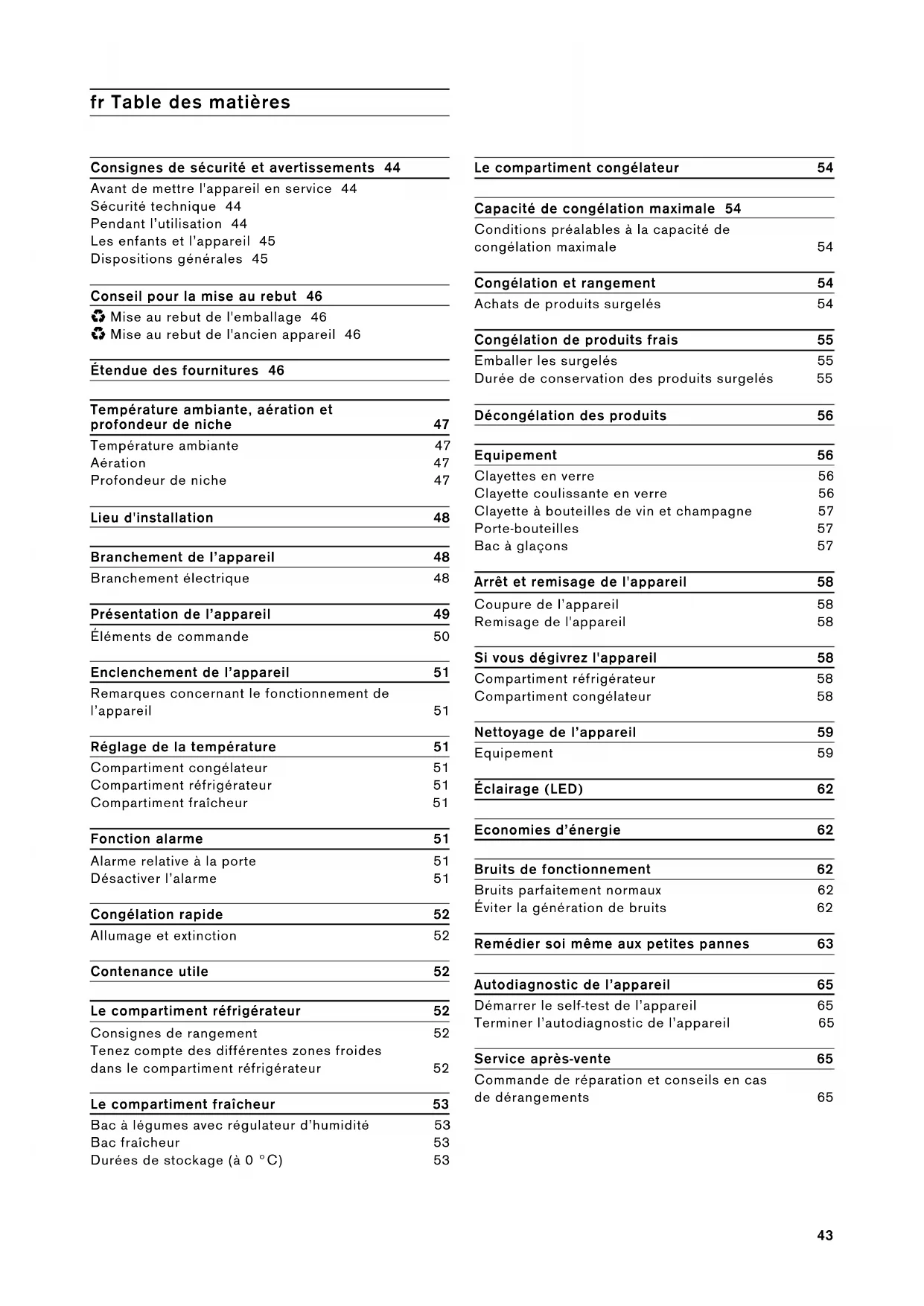 - Mise au rebut de l'ancien appareil 46 Étendue des fournitures 46 Température ambiante, aération et profondeur de niche 47 Température ambiante 47 Aération 47 Profondeur de niche 47 Lieu d'installation 48 Branchement de l’appareil 48 Branchement électrique 48 Présentation de l’appareil 49 Éléments de commande 50 Enclenchement de l’appareil 51 Remarques concernant le fonctionnement de l’appareil 51 Réglage de la température 51 Compartiment congélateur 51 Compartiment réfrigérateur 51 Compartiment fraîcheur 51 Fonction alarme 51 Alarme relative à la porte 51 Désactiver l’alarme 51 Congélation rapide 52 Allumage et extinction 52 Contenance utile 52 Le compartiment réfrigérateur 52 Consignes de rangement 52 Tenez compte des différentes zones froides dans le compartiment réfrigérateur 52 Le compartiment fraîcheur 53 Bac à légumes avec régulateur d’humidité 53 Bac fraîcheur 53 Durées de stockage (à 0 °C) 53 Le compartiment congélateur 54 Capacité de congélation maximale 54 Conditions préalables à la capacité de congélation maximale 54 Congélation et rangement 54 Achats de produits surgelés 54 Congélation de produits frais 55 Emballer les surgelés 55 Durée de conservation des produits surgelés 55 Décongélation des produits 56 Equipement 56 Clayettes en verre 56 Clayette coulissante en verre 56 Clayette à bouteilles de vin et champagne 57 Porte-bouteilles 57 Bac à glaçons 57 Arrêt et remisage de l'appareil 58 Coupure de l’appareil 58 Remisage de l'appareil 58 Si vous dégivrez l'appareil 58 Compartiment réfrigérateur 58 Compartiment congélateur 58 Nettoyage de l’appareil 59 Equipement 59 Éclairage (LED) 62 Economies d’énergie 62 Bruits de fonctionnement 62 Bruits parfaitement normaux 62 Éviter la génération de bruits 62 Remédier soi même aux petites pannes 63 Autodiagnostic de l’appareil 65 Démarrer le self-test de l’appareil 65 Terminer l’autodiagnostic de l’appareil 65 Service après-vente 65 Commande de réparation et conseils en cas de dérangements 6544 m Consignes de sécurité et avertissements Avant de mettre l'appareil en service Veuillez lire attentivement et entièrement les informations figurant dans les notices d'utilisation et de montage. Elle contiennent des remarques importantes concernant l'installation, l'utilisation et l'entretien de l'appareil. Le fabricant décline toute responsabilité si les consignes et mises en garde contenues dans la notice d'utilisation ne sont pas respectées. Veuillez conserver ces documents en vue d’une réutilisation ultérieure ou pour le cas où l’appareil changerait de propriétaire. Sécurité technique L'appareil contient une petite quantité de R600a, un fluide réfrigérant respectueux de l'environnement, mais inflammable. Pendant le transport et la mise en place de l'appareil, veillez à ne pas endommager les tuyauteries du circuit frigorifique. Le fluide réfrigérant peut s’enflammer en jaillissant ou provoquer des blessures oculaires. Si l'appareil est endommagé ▯ éloignez de l'appareil toute flamme nue ou source d'inflammation, ▯ aérez bien la pièce pendant quelques minutes, ▯ éteignez l'appareil puis débranchez la fiche mâle de la prise de courant, ▯ prévenez le service après-vente. Plus l'appareil contient du fluide réfrigérant et plus grande doit être la pièce dans laquelle il se trouve. Dans les pièces trop petites, un mélange gaz-air inflammable peut se former en cas de fuite. Comptez 1 m³ de volume minimum de la pièce pour 8 g de fluide réfrigérant. La quantité de fluide présente dans l'appareil est indiquée sur la plaque signalétique située à l'intérieur de ce dernier. Si le cordon d’alimentation électrique de cet appareil a été endommagé, il faut confier son remplacement au fabricant, au service après- vente ou à une personne détenant des qualifications similaires. Les installations et réparations inexpertes peuvent engendrer des risques considérables pour l’utilisateur. Les réparations ne pourront être réalisées que par le fabricant, le service après-vente ou une personne détenant des qualifications similaires. Il ne faut utiliser que les pièces d'origine du fabricant. Le fabricant ne garantit que les pièces d'origine car elles seules remplissent les exigences de sécurité. S’il faut allonger le cordon de raccordement au secteur avec un prolongateur, procurez- vous-le exclusivement auprès du service après-vente. Pendant l’utilisation ▯ N’utilisez pas d’appareils électriques à l’intérieur de l’appareil (par ex. appareils de chauffage, machine à glaçons, etc.). Risque d’explosion ! ▯ Ne nettoyez jamais l’intérieur de l’appareil avec un nettoyeur à vapeur ! La vapeur risque d’atteindre des pièces électriques et de provoquer un court- circuit. Risque d’électrocution ! ▯ Pour détacher le givre ou les couches de glace, n’utilisez jamais d’objets pointus ou présentant des arêtes vives. Vous risqueriez d’endommager les tubulures dans lesquelles circule le produit réfrigérant. Si le fluide réfrigérant jaillit, il peut provoquer des lésions oculaires ou s’enflammer. ▯ Ne stockez dans l’appareil ni produits contenant des gaz propulseurs inflammables (par ex. bombes aérosols) ni produits explosifs. Risque d’explosion ! ▯ Ne vous servez pas des socles, clayettes et portes comme marchepieds ou pour vous appuyer.45 ▯ Pour dégivrer et nettoyer l’appareil, débranchez la fiche mâle de la prise de courant ou retirez le fusible / désarmez le disjoncteur. Pour débrancher l’appareil, tirez sur la fiche mâle et non pas sur son cordon. ▯ Stockez les boissons fortement alcoolisées en position verticale dans des récipients bien fermés. ▯ L’huile et la graisse ne doivent pas entrer en contact avec les parties en matières plastiques et le joint de porte. Ces derniers pourraient sinon devenir poreux. ▯ Ne recouvrez et n