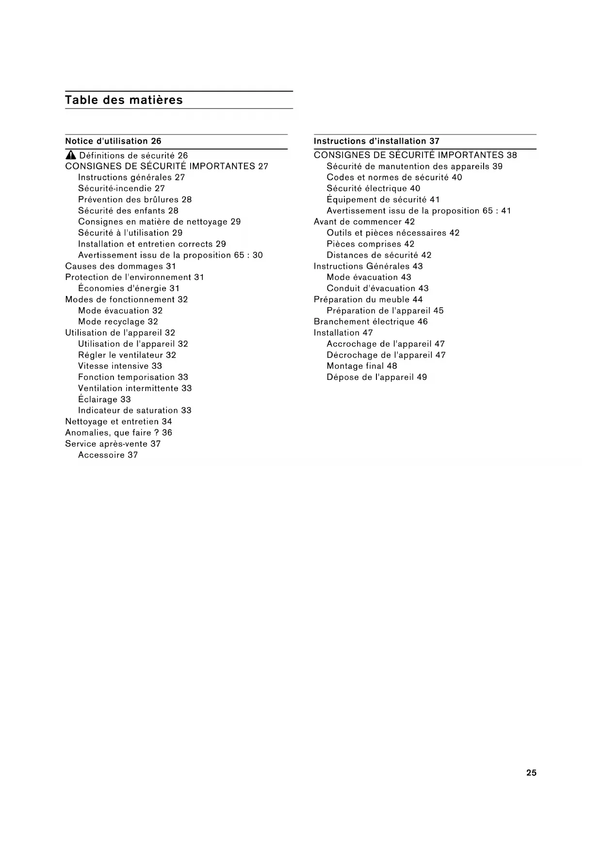 Instructions générales 27 Sécurité-incendie 27 Prévention des brûlures 28 Sécurité des enfants 28 Consignes en matière de nettoyage 29 Sécurité à l'utilisation 29 Installation et entretien corrects 29 Avertissement issu de la proposition 65 : 30 Causes des dommages 31 Protection de l'environnement 31 Économies d'énergie 31 Modes de fonctionnement 32 Mode évacuation 32 Mode recyclage 32 Utilisation de l'appareil 32 Utilisation de l'appareil 32 Régler le ventilateur 32 Vitesse intensive 33 Fonction temporisation 33 Ventilation intermittente 33 Éclairage 33 Indicateur de saturation 33 Nettoyage et entretien 34 Anomalies, que faire ? 36 Service après-vente 37 Accessoire 37 Instructions d’installation 37