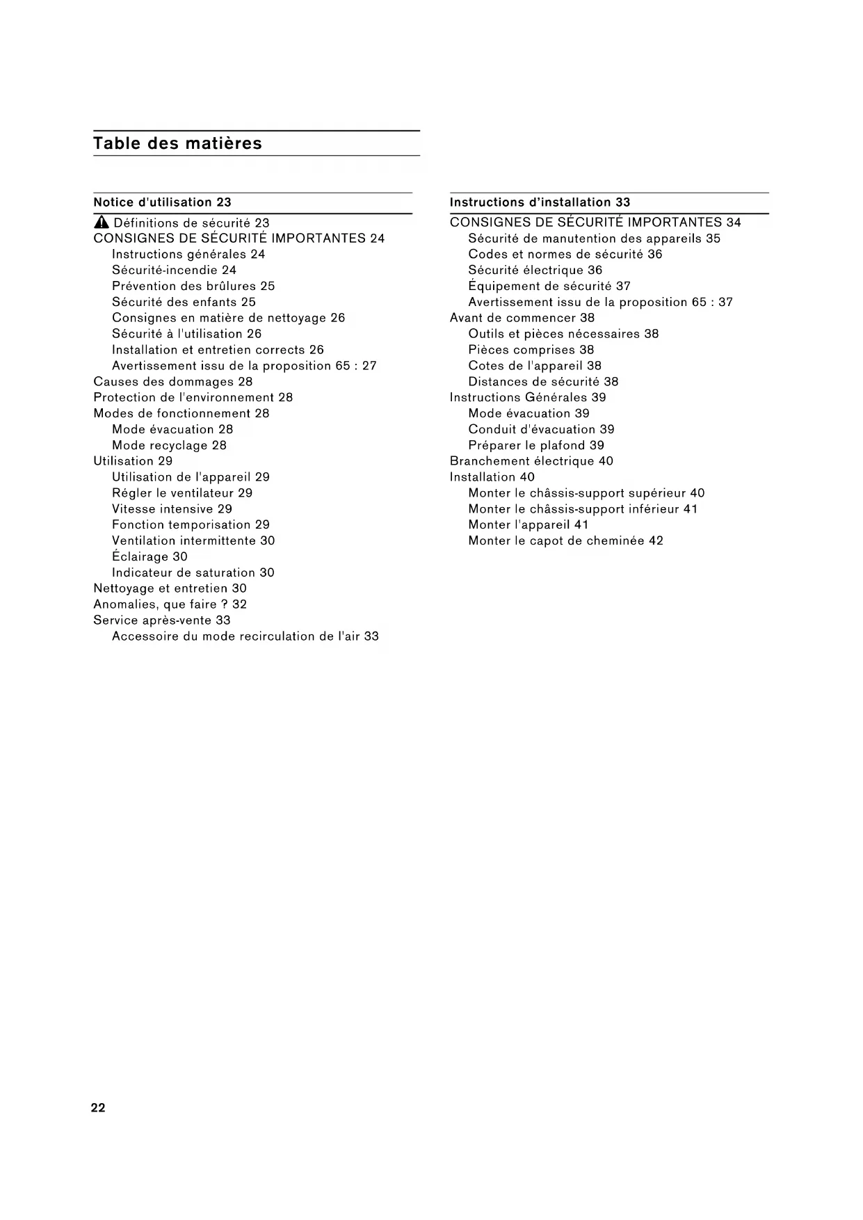Instructions générales 24 Sécurité-incendie 24 Prévention des brûlures 25 Sécurité des enfants 25 Consignes en matière de nettoyage 26 Sécurité à l'utilisation 26 Installation et entretien corrects 26 Avertissement issu de la proposition 65 : 27 Causes des dommages 28 Protection de l'environnement 28 Modes de fonctionnement 28 Mode évacuation 28 Mode recyclage 28 Utilisation 29 Utilisation de l'appareil 29 Régler le ventilateur 29 Vitesse intensive 29 Fonction temporisation 29 Ventilation intermittente 30 Éclairage 30 Indicateur de saturation 30 Nettoyage et entretien 30 Anomalies, que faire ? 32 Service après-vente 33 Accessoire du mode recirculation de l'air 33 Instructions d’installation 33