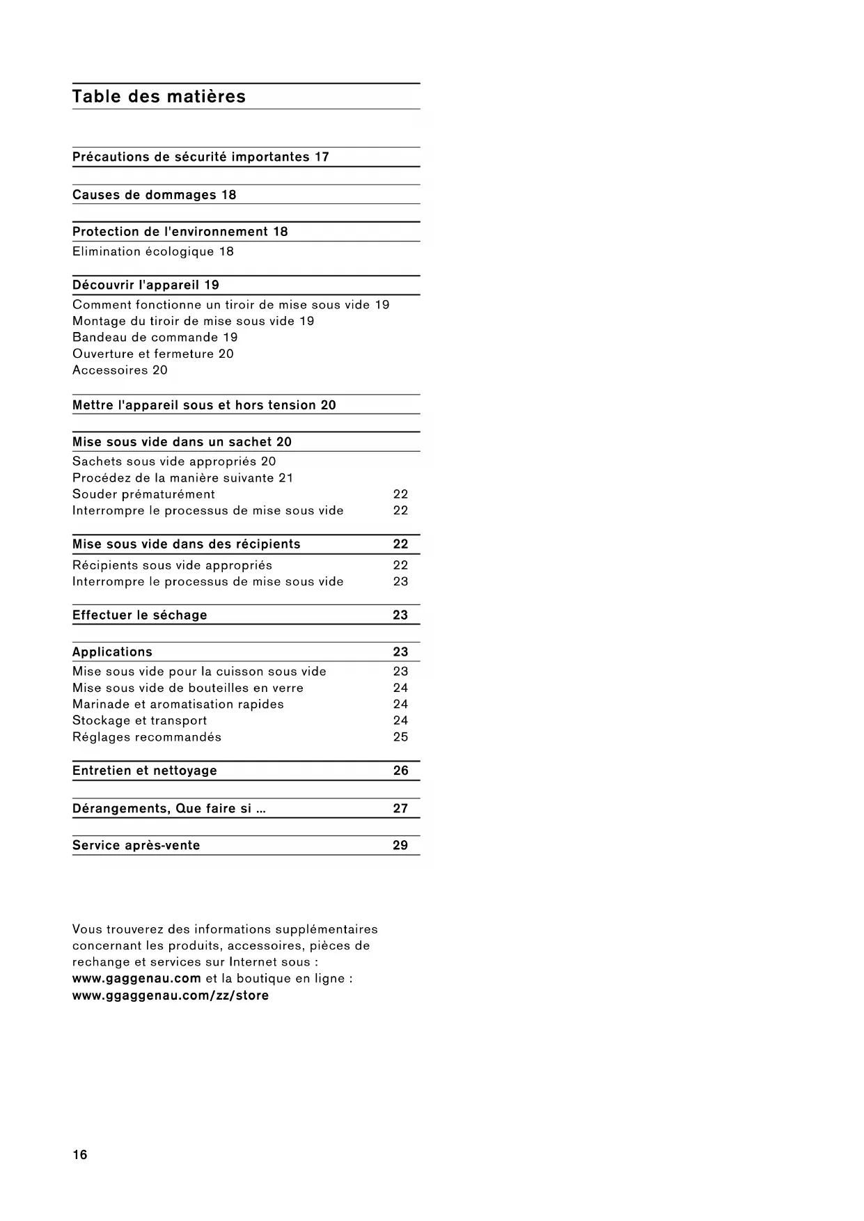 NL 088 424 4030 B 070 222 14816 Table des matières Notice d'utilisation Précautions de sécurité importantes 17 Causes de dommages 18 Protection de l'environnement 18 Elimination écologique 18 Découvrir l'appareil 19 Comment fonctionne un tiroir de mise sous vide 19 Montage du tiroir de mise sous vide 19 Bandeau de commande 19 Ouverture et fermeture 20 Accessoires 20 Mettre l'appareil sous et hors tension 20 Mise sous vide dans un sachet 20 Sachets sous vide appropriés 20 Procédez de la manière suivante 21 Souder prématurément 22 Interrompre le processus de mise sous vide 22 Mise sous vide dans des récipients 22 Récipients sous vide appropriés 22 Interrompre le processus de mise sous vide 23 Effectuer le séchage 23 Applications 23 Mise sous vide pour la cuisson sous vide 23 Mise sous vide de bouteilles en verre 24 Marinade et aromatisation rapides 24 Stockage et transport 24 Réglages recommandés 25 Entretien et nettoyage 26 Dérangements, Que faire si … 27 Service après-vente 29 : Vous trouverez des informations supplémentaires concernant les produits, accessoires, pièces de rechange et services sur Internet sous : www.gaggenau.com et la boutique en ligne : www.ggaggenau.com/zz/store17 m Précautions de sécurité importantes Lire attentivement ce manuel. Ce n'est qu'alors que vous pourrez utiliser votre appareil correctement et en toute sécurité. Conserver la notice d'utilisation et de montage pour un usage ultérieur ou pour le propriétaire suivant. Contrôler l'état de l'appareil après l'avoir déballé. Ne pas le raccorder s'il présente des avaries de transport. Cet appareil est destiné exclusivement à une utilisation domestique et non professionnelle. Utilisez exclusivement l'appareil pour mettre sous vide des aliments dans des sachets sous vide et des récipients sous vide, ainsi que pour souder des films. Utilisez cet appareil uniquement dans des pièces fermées. Cet appareil peut être utilisé par des enfants de 8 ans ou plus et par des personnes dotées de capacités physiques, sensorielles ou mentales réduites ou disposant de connaissances ou d’expérience insuffisantes, sous la surveillance d'un tiers responsable de leur sécurité ou bien lorsqu'ils ont reçu des instructions liées à l'utilisation de l'appareil en toute sécurité et qu'ils ont intégré les risques qui en résultent. Les enfants ne doivent pas jouer avec l'appareil. Le nettoyage et l'entretien effectué par l'utilisateur ne doivent pas être accomplis par des enfants, sauf s'ils sont âgés de 8 ans et plus et qu'un adulte les surveille. Les enfants de moins de 8 ans doivent être tenus à distance de l'appareil et du cordon d'alimentation. Cet appareil est conçu pour une utilisation jusqu'à une altitude maximale de 2 000 m. Risque de brûlure ! La barre de soudure de la chambre de vide devient très chaude en cas d'utilisation fréquente et de temps de soudure prolongés. Ne touchez jamais la barre de soudure chaude. Éloignez les enfants. Risque de choc électrique ! ▯ De l'humidité qui pénètre peut occasionner un choc électrique. Ne pas utiliser de nettoyeur haute pression ou de nettoyer à vapeur. Risque de choc électrique ! ▯ Un appareil défectueux peut provoquer un choc électrique. Ne jamais mettre en service un appareil défectueux. Débrancher la fiche secteur ou enlever le fusible dans le boîtier à fusibles. Appeler le service après-vente. Risque de choc électrique ! ▯ Les réparations inexpertes sont dangereuses.Seul un technicien du service après-vente formé par nos soins est habilité à effectuer des réparations.Si l'appareil est défectueux, retirer la fiche secteur ou enlever le fusible dans le boîtier à fusibles. Appeler le service aprèsvente. Risque d’incendie ! Assurez-vous que la barre de soudure de la chambre de vide a refroidi. Les vapeurs inflammables peuvent s'enflammer. Ne mettez aucun liquide inflammable sous vide dans un sachet sous vide. Ne rangez aucun objet ni matériau inflammables à l'intérieur de l'appareil. Risque de blessures ! ▯ Les petits éclats présent sur le couvercle en verre peuvent entraîner son implosion en cas de mise sous vide. Retirez la fiche secteur ou déconnectez le fusible dans le boîtier à fusibles. Appelez le service après- vente. Risque de blessures ! ▯ Lors de la mise sous vide, la chambre de vide et le couvercle en verre se déforment en raison de la forte dépression. Les bocaux, les autres récipients durs ainsi que les aliments indéformables qui sont mis sous vide dans la chambre lorsque le couvercle est fermé, ne doivent pas toucher ce couvercle. Sinon la couche de protection du verre est endommagée et le couvercle en verre peut éclater. Les récipients durs et les aliments indéformables ne doivent pas dépasser une hauteur maximale de 80 mm. Risque de blessures ! ▯ Une mauvaise utilisation du tiroir de mise sous vide peut entraîner des blessures. N'introduisez aucun tuyau raccordé à l'appareil dans les orifices du corps. Ne mettez aucun animal vivant sous vide.18 Causes de dommages Attention ! – Avant chaque utilisation, vérifiez que l'appareil n'est pas endommagé. Veillez notamment à l'intégrité du couvercle en verre. Ne faites pas fonctionner l'appareil s'il présente des endommagements. Appelez le service après- vente. – Ouvrez, puis fermez lentement le couvercle en verre. – Ne placez aucun objet sur le couvercle en verre. N'utilisez pas l'appareil comme surface de travail ni pour y poser des objets. Évitez que des objets ne puissent tomber sur le couvercle en verre. Sortez complètement le tiroir et jusqu'à la butée pour l'utiliser. Refermez entièrement le tiroir lorsque vous ne l'utilisez pas. – Avant de fermer le couvercle en verre, assurez-vous que la chambre de vide ne contient aucun corps étranger. – Veillez à ce que les joints ne soient pas endommagés par des objets tranchants ou pointus. – Vérifiez l'emplacement correct du joint 