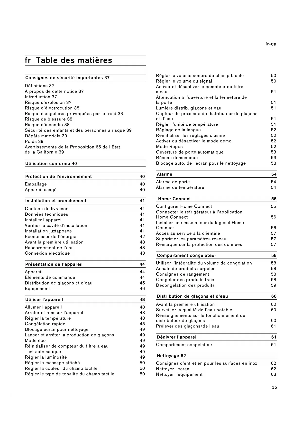 Risque d’électrocution Toute installation ou réparation incorrecte peut engendrer des risques considérables pour l’utilisateur. ▯ Veillez à ne pas coincer ou endommager le câble d'alimentation en posant l'appareil. ▯ Dans une optique préventive, débranchez l'appareil dès que le câble d'alimentation est endommagé. Faites remplacer le câble secteur par le fabricant, le service à la clientèle ou une personne présentant une qualification équivalente. ▯ N'utilisez pas de rallonge, de bloc multiprise ou d'adaptateur. ▯ Débranchez la fiche de contact ou ramenez le disjoncteur en position éteinte avant d'effectuer l'entretien ou les opérations de montage autorisées sur l'appareil. Avant de nettoyer l'appareil, actionnez l'interrupteur principal Marche / Arrêt pour éteindre l'appareil. Les clayettes en verre et autres équipements peuvent être déplacés sans danger pendant que l'appareil est en marche. ▯ Ne retirez ni sectionnez jamais le troisième conducteur (conducteur de mise à la terre) du cordon d'alimentation. ▯ Ne décongelez et ne nettoyez jamais l’appareil avec un nettoyeur à vapeur. La vapeur risque d’atteindre des pièces électriques et de provoquer un court- circuit. ▯ Ne confiez la réparation ou le remplacement de l'appareil, du cordon et des accessoires qu'au fabricant ou à un technicien autorisé. ▯ N’utilisez que des pièces de rechange d'origine venant du fabricant. Le fabricant garantit que ces pièces d'origine remplissent les exigences de sécurité. Risque d'engelures provoquées par le froid ▯ Ne portez jamais des produits surgelés à la bouche immédiatement après les avoir sortis du compartiment congélateur. ▯ Évitez tout contact prolongé de la peau avec le produit congelé, la glace et les tubulures présents dans le compartiment congélateur. Risque de blessure Les récipients contenant des boissons gazeuses risquent d'éclater. Ne rangez jamais de boissons gazeuses dans le compartiment congélateur. Risque d’incendie Les blocs multiprises ou blocs secteur portables peuvent surchauffer et provoquer un incendie. N’utilisez pas de blocs multiprises ni de blocs secteur portables derrière l’appareil.39 9 Consignes de sécurité importantes VEUILLEZ LIRE ET CONSERVER CES CONSIGNES! Sécurité des enfants et des personnes à risque Personnes à risques : ▯ Les enfants,▯ Les personnes présentant un handicap physique, psychique ou sensoriel, ▯ Les personnes qui ne savent pas suffisamment comment utiliser l'appareil de manière sûre. Mesures : ▯ Ne laissez jamais des enfants jouer avec l’appareil. ▯ Assurez-vous que les enfants et les personnes à risques ont bien compris la nature des dangers. ▯ Surveillez les enfants pendant le nettoyage et la maintenance. Risque d’asphyxie ▯ Appareils équipés d’une serrure : rangez la clé hors de portée des enfants. ▯ Ne confiez jamais l’emballage et ses pièces constitutives aux enfants. Dégâts matériels Pour éviter des dégâts matériels : ▯ Ne vous servez jamais du socle, des glissières ou des portes comme marchepieds et ne vous appuyez jamais dessus. ▯ Veillez à ce que les pièces en matière plastique et les joints de porte soient exempts d'huile et de graisse. ▯ Pour débrancher, ne saisissez que la fiche mâle, pas le cordon de branchement. Poids L’appareil est très lourd. Il faut être au moins 2 deux personnes pour installer et transporter l'appareil. ~ "Installation et branchement" à la page 41 Avertissements de la Proposition 65 de l’État de la Californie Ce produit pourrait contenir un produit chimique reconnu par l'État de la Californie comme cancérigène ou ayant des effets nocifs sur la reproduction. Par conséquent, l'emballage de votre produit pourrait porter l'étiquette suivante, comme requis par la Californie :40 fr-ca Utilisation conforme