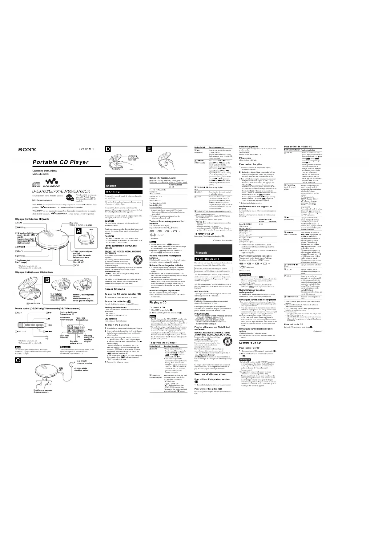in.) Mass (excluding accessories) Approx. 170 g (6.0 oz) Operating temperature 5°C - 35°C (41°F - 95°F)Design and specifications are subject to change withoutnotice. Supplied Accessories D-EJ760:Headphones/earphones (1)D-EJ761:AC power adaptor (1)Headphones/earphones (1)D-EJ765:AC power adaptor (1)Headphones/earphones with remote control (1)Rechargeable batteries (2)Battery carrying case (1)D-EJ768CK:AC power adaptor (1)Headphones/earphones (1)Car connecting pack (1)Car battery cord (1)Rotary commander (1)Velcro tape for the CD player (2)Velcro tape for the rotary commander (1) Système stéréo, enregistreur cassette, enregistreur de radiocassette, etc. LINE OUT Français Pour désactiver le bip de fonctionnement Vous pouvez désactiver le bip de fonctionnement émis parvotre casque/vos écouteurs lorsque vous utilisez le lecteur CD. 1 Retirez la source d’alimentation (adaptateur secteur, piles rechargeables ou piles sèches) du lecteur CD. 2 Raccordez la source d’alimentation en appuyant sur CHARGE/x du lecteur CD ou sur x de la télécommande. Pour activer le bip Retirez la source d’alimentation, puis raccordez-la sans appuyer sur CHARGE/x ou x. Lecture de vos plages favorites en insérant des signets (Lecture des plages repérées par des signets) Vous pouvez ajouter des signets à maximum 99 plagespour chaque CD. Vous pouvez utiliser cette fonction pourau maximum 5 CD. Pour insérer des signets 1 Pendant la lecture de la plage où vous souhaitez insérer un signet, appuyez sur le levier de réglage etmaintenez-le enfoncé (appuyez sur u et maintenezcette touche enfoncée pour la télécommande) jusqu’àce que “ (Bookmark)” clignote sur l’écran.Lorsque le signet a été inséré, “” clignote pluslentement. 2 Recommencez l’étape 1 pour insérer des signets sur les plages souhaitées. Pour écouter les plages auxquelles vous avez inséré des signets 1 Appuyez plusieurs fois sur P MODE/ jusqu’à ce que “” clignote. 2 Appuyez sur le levier de réglage (appuyez sur u pour la télécommande). ” s’allume dans la fenêtre d’affichage et la lecturedes plages auxquelles vous avez inséré un signetcommence. Pour supprimer les signets Pendant la lecture de la plage à laquelle vous avec inséréun signet, appuyez sur le levier de réglage et maintenez-leenfoncé (appuyez sur u et maintenez cette toucheenfoncée pour la télécommande) jusqu’à ce que “ disparaisse de la fenêtre d’affichage. Pour vérifier les plages auxquelles vous avez inséré des signets Pendant la lecture des plages auxquelles vous avez insérédes signets, “” continue de clignoter lentement dans lafenêtre d’affichage. Remarques