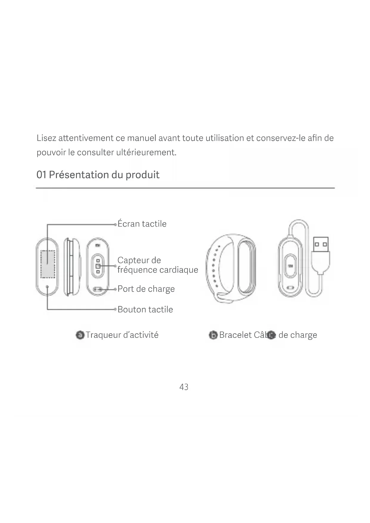 Bracelet Câble de charge Traqueur d’activité Écran tactile Bouton tactile Capteur de fréquence cardiaque Port de charge44 02 Installation