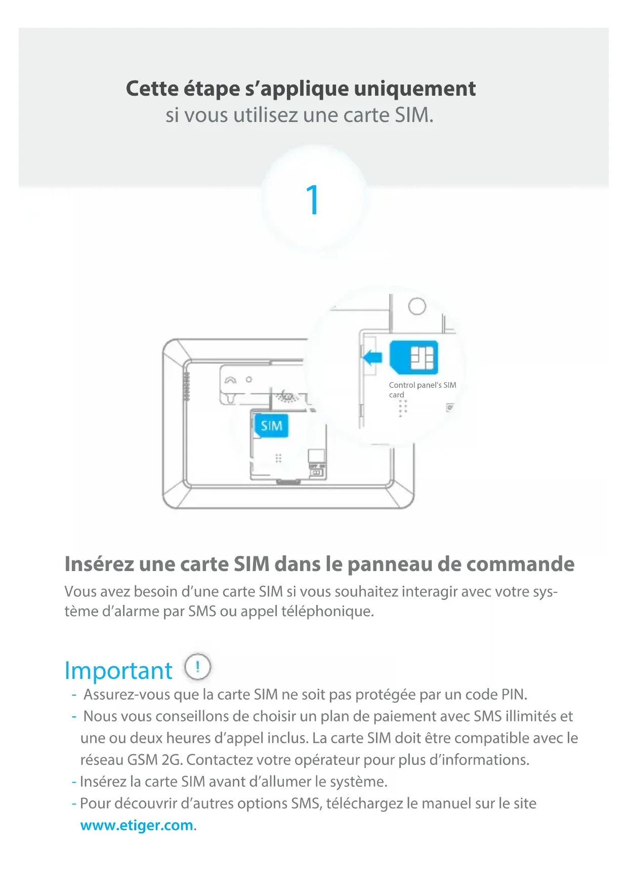 Si vous utilisez ce système d'alarme avec une carte SIM et que vous n'êtes pas en mesure d'utiliser les applications iOS et Android, lisez le manuel complet pour en savoir plus sur les interactions par SMS et appel téléphonique. Le manuel complet peut être consulté sur etiger.com.