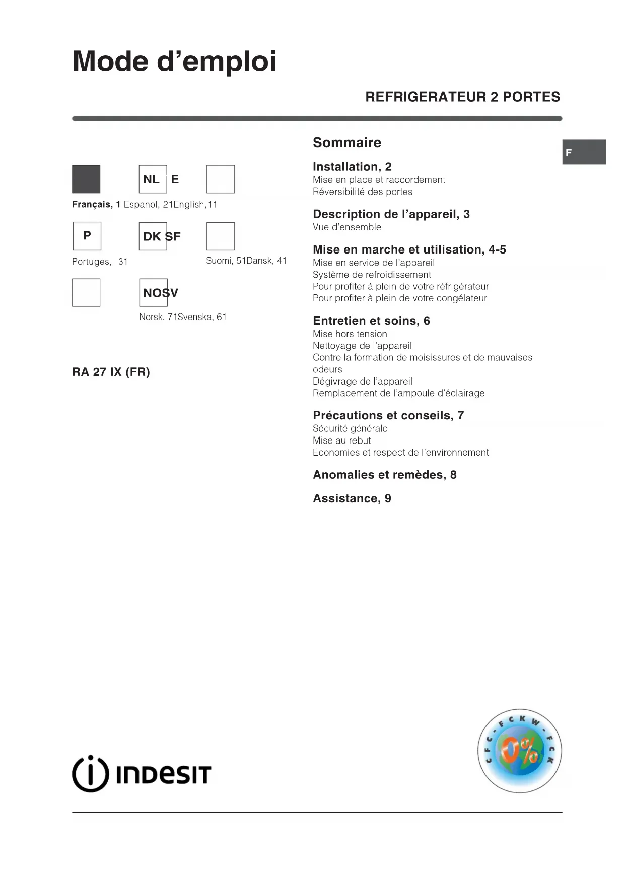 RA 27 IX (FR) (0) - Réfrigérateur INDESIT - Notice d'utilisation et mode d'emploi gratuit
