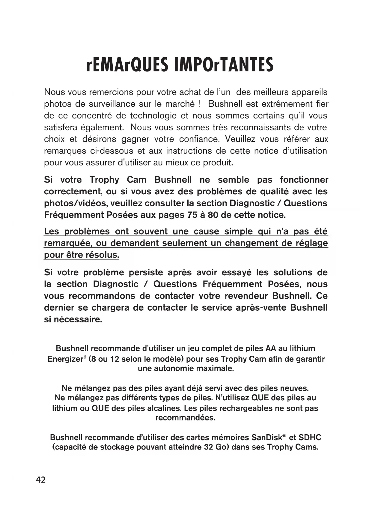 rEMArQuES IMPOrTANTES Nous vous remercions pour votre achat de l’un des meilleurs appareils photos de surveillance sur le marché ! Bushnell est extrêmement fier de ce concentré de technologie et nous sommes certains qu’il vous satisfera également. Nous vous sommes très reconnaissants de votre choix et désirons gagner votre confiance. Veuillez vous référer aux remarques ci-dessous et aux instructions de cette notice d’utilisation pour vous assurer d'utiliser au mieux ce produit. Si votre Trophy Cam Bushnell ne semble pas fonctionner correctement, ou si vous avez des problèmes de qualité avec les photos/vidéos, veuillez consulter la section Diagnostic / Questions Fréquemment Posées aux pages 75 à 80 de cette notice. Les problèmes ont souvent une cause simple qui n’a pas été remarquée, ou demandent seulement un changement de réglage pour être résolus. Si votre problème persiste après avoir essayé les solutions de la section Diagnostic / Questions Fréquemment Posées, nous vous recommandons de contacter votre revendeur Bushnell. Ce dernier se chargera de contacter le service après-vente Bushnell si nécessaire. Bushnell recommande d'utiliser un jeu complet de piles AA au lithium Energizer