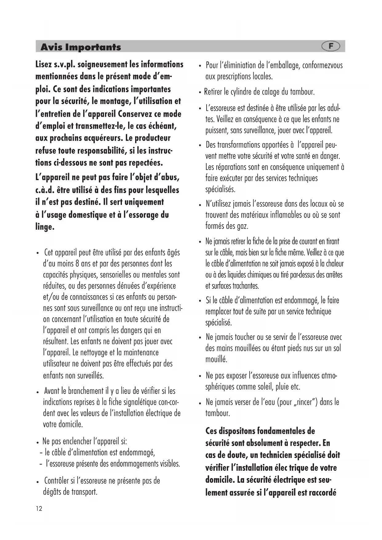 F12 Lisez s.v.pl. soigneusement les informations mentionnées dans le présent mode d’em- ploi. Ce sont des indications importantes pour la sécurité, le montage, l’utilisation et l’entretien de l’appareil Conservez ce mode d’emploi et transmettez-le, le cas échéant, aux prochains acquéreurs. Le producteur refuse toute responsabilité, si les instruc- tions ci-dessous ne sont pas repectées. L’appareil ne peut pas faire l’objet d’abus, c.à.d. être utilisé à des fins pour lesquelles il n’est pas destiné. Il sert uniquement à l’usage domestique et à l’essorage du linge.