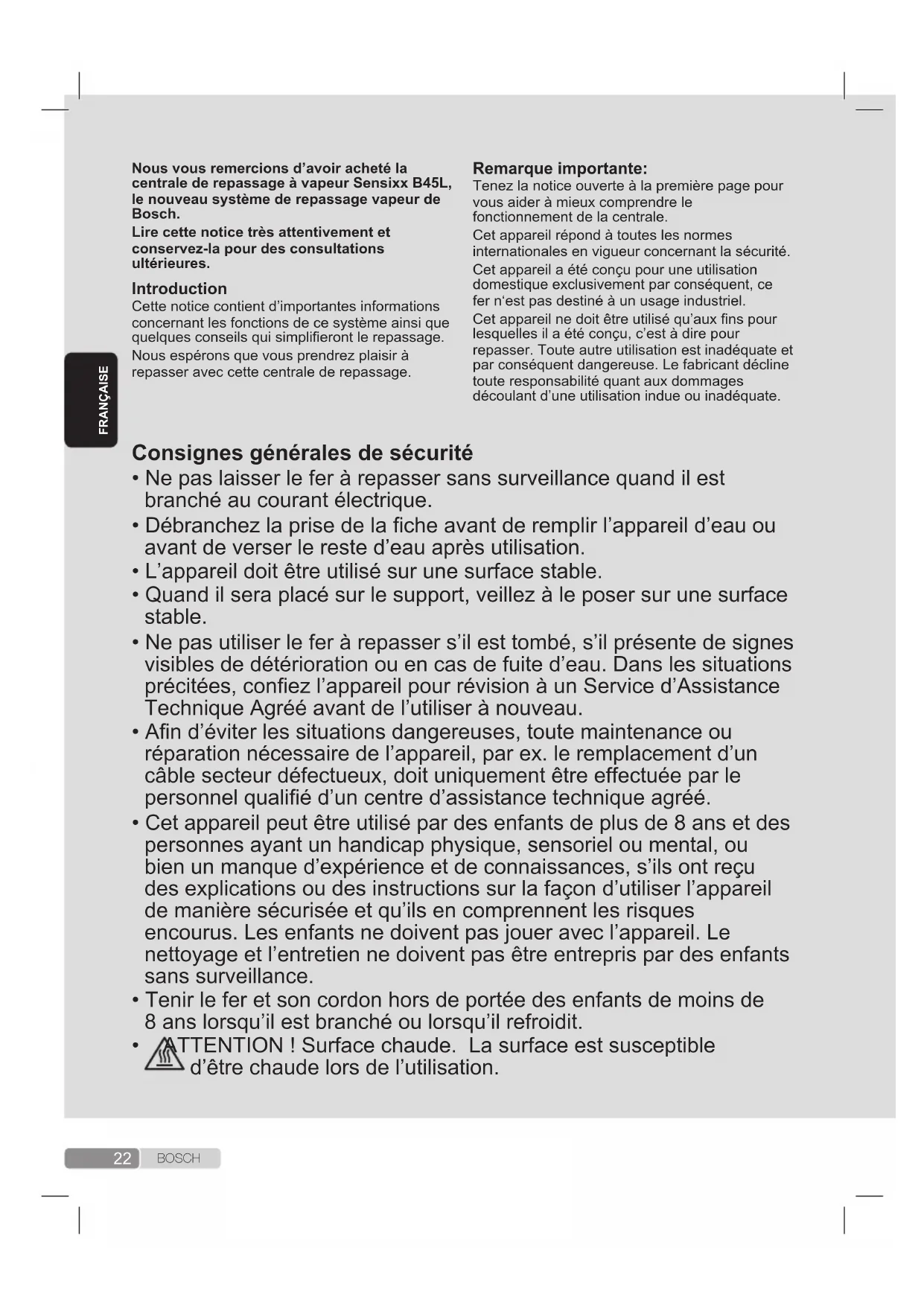 - Just press the trigger once again and the iron will stop steaming at once. If the above does not solve the problem, get in touch with an authorised technical service. YoucandownloadthismanualfromthelocalhomepagesofBosch.22 B O S C H FRANÇAISE Nousvousremercionsd’avoirachetéla centralederepassageàvapeurSensixxB45L, lenouveausystèmederepassagevapeurde Bosch. Lirecettenoticetrèsattentivementet conservez-lapourdesconsultations ultérieures. Introduction Cette notice contient d’importantes informations concernant les fonctions de ce système ainsi que quelques conseils qui simplieront le repassage. Nous espérons que vous prendrez plaisir à repasser avec cette centrale de repassage. Remarqueimportante: Tenez la notice ouverte à la première page pour vous aider à mieux comprendre le fonctionnement de la centrale. Cet appareil répond à toutes les normes internationales en vigueur concernant la sécurité. Cet appareil a été conçu pour une utilisation domestique exclusivement par conséquent, ce fer n‘est pas destiné à un usage industriel. Cet appareil ne doit être utilisé qu’aux ns pour lesquelles il a été conçu, c’est à dire pour repasser. Toute autre utilisation est inadéquate et par conséquent dangereuse. Le fabricant décline toute responsabilité quant aux dommages découlant d’une utilisation indue ou inadéquate. Consignesgénéralesdesécurité