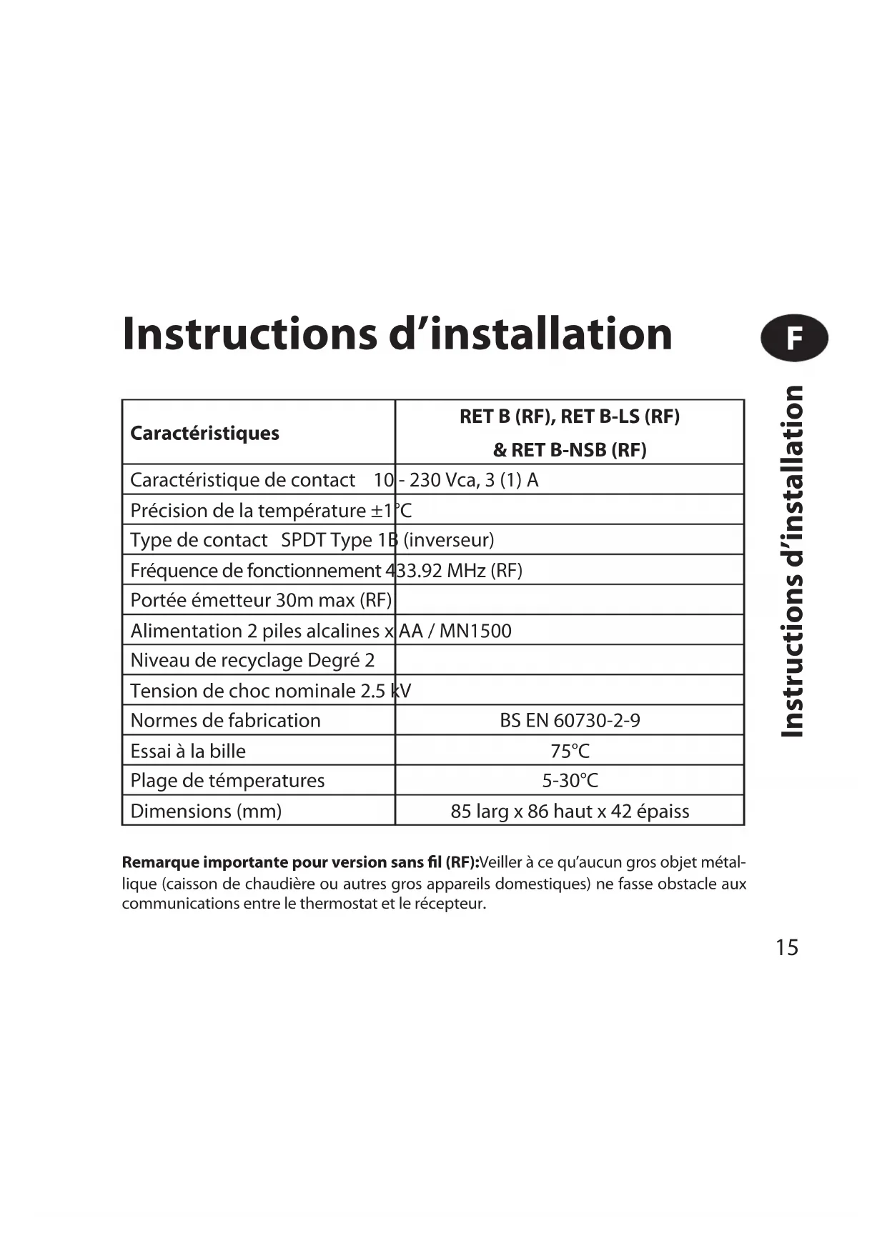 Caractéristiques RET B (RF), RET B-LS (RF) & RET B-NSB (RF) Caractéristique de contact 10 - 230 Vca, 3 (1) A Précision de la température ±1°C Type de contact SPDT Type 1B (inverseur) Fréquence de fonctionnement 433.92 MHz (RF) Portée émetteur 30m max (RF) Alimentation 2 piles alcalines x AA / MN1500 Niveau de recyclage Degré 2 Tension de choc nominale 2.5 kV Normes de fabrication BS EN 60730-2-9 Essai à la bille 75°C Plage de témperatures 5-30°C Dimensions (mm) 85 larg x 86 haut x 42 épaiss16 Montage Fixez l’appareil à une hauteur d’environ 1,5 m du sol, à l’écart des courants d’air ou des sources de chaleur telles que radiateurs, ammes nues ou lumière directe du soleil. Instructions d’installation F17 Câblage (versions câblées seulement)